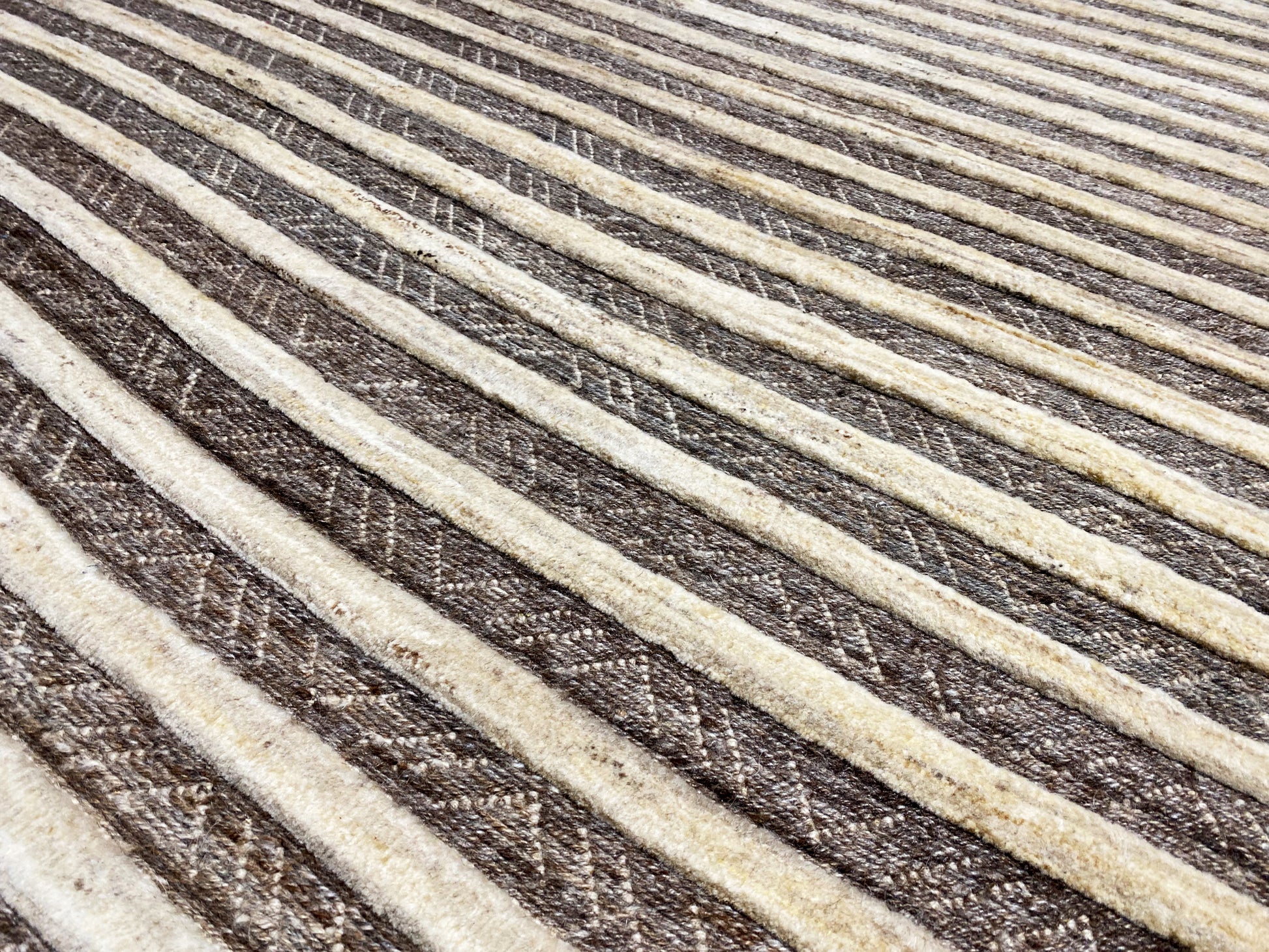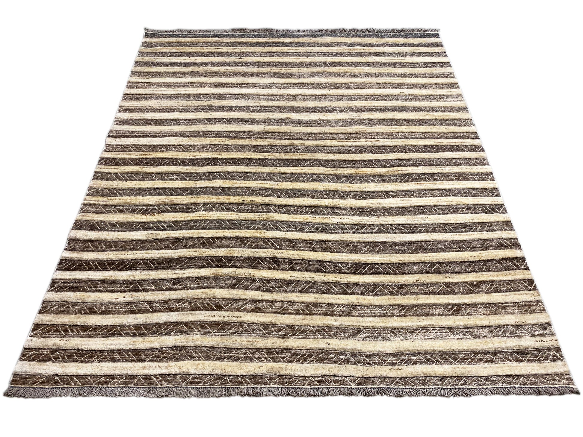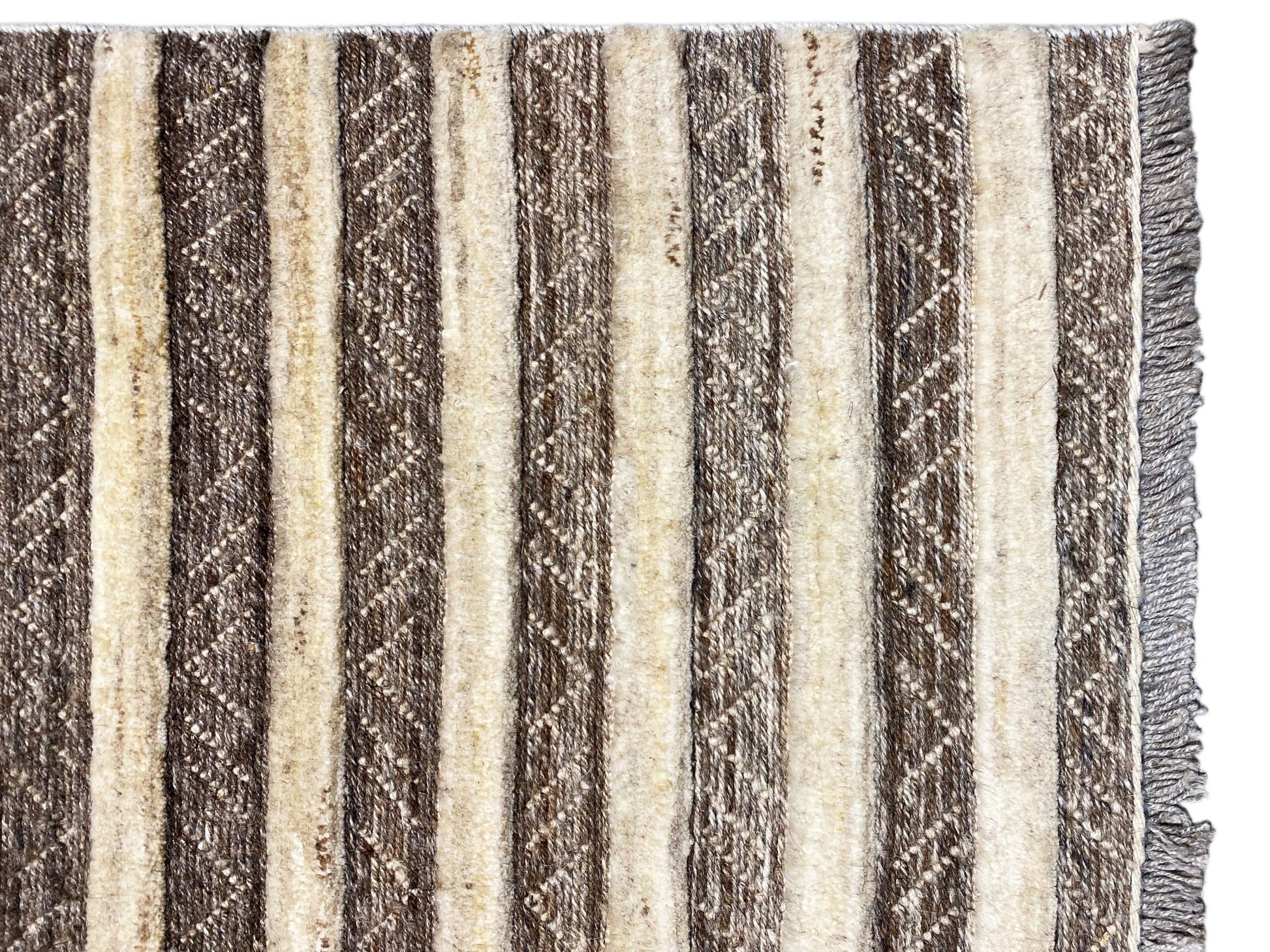 Esta alfombra Kelim Gabbeh tejida a mano, con unas medidas de 186x157 cm, destaca por su elegancia natural y su alta calidad, elaborada con 100% lana hilada a mano. El fino patrón de rayas horizontales en tonos armónicos de gris y beige se complementa con detalles geométricos discretos que aportan una profundidad moderna a la alfombra. Gracias a su estilo decorativo atemporal, esta pieza resistente se integra perfectamente en ambientes escandinavos o minimalistas, creando una atmósfera acogedora y cálida. La estructura densa de la lana natural garantiza no solo una larga durabilidad, sino también una sensación especialmente agradable al pisar, lo que convierte a esta alfombra en un elemento funcional destacado en cualquier sala de estar o comedor.