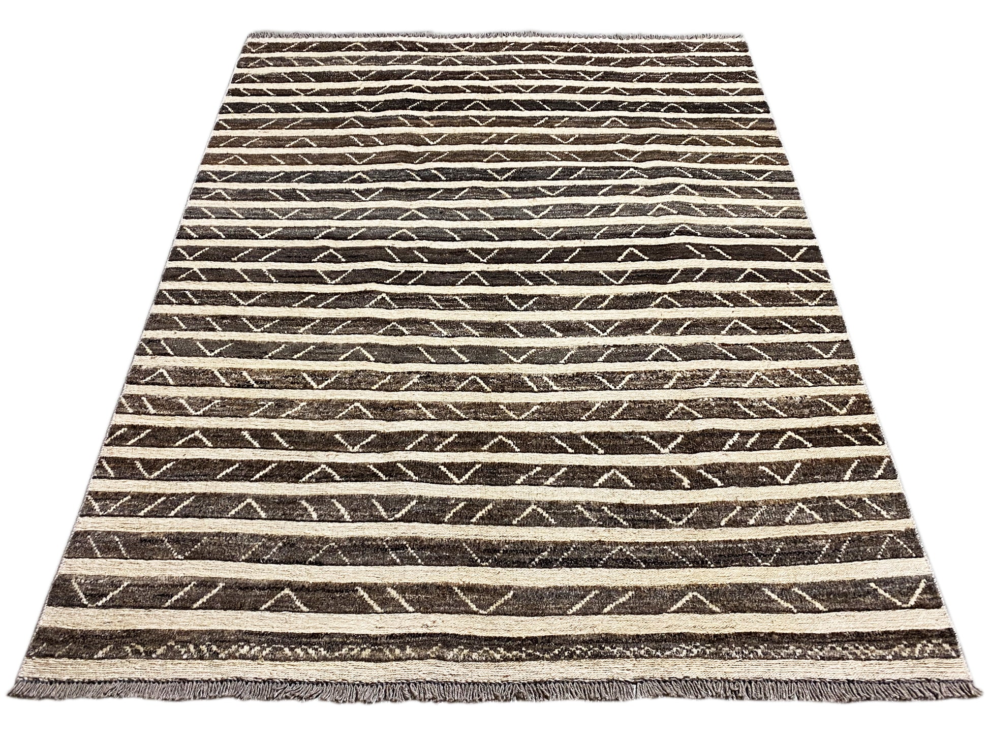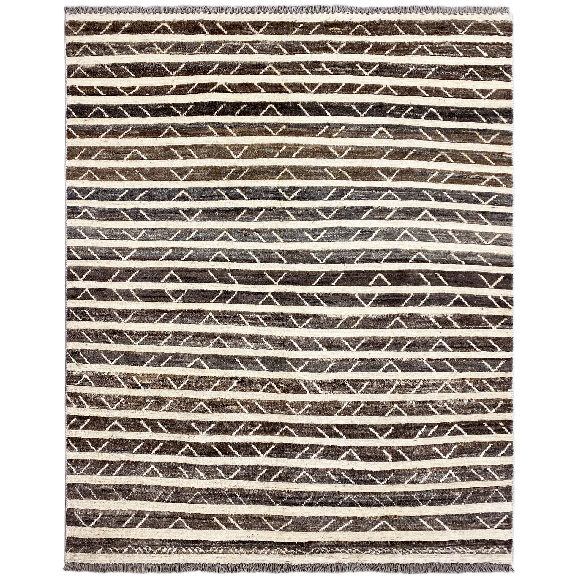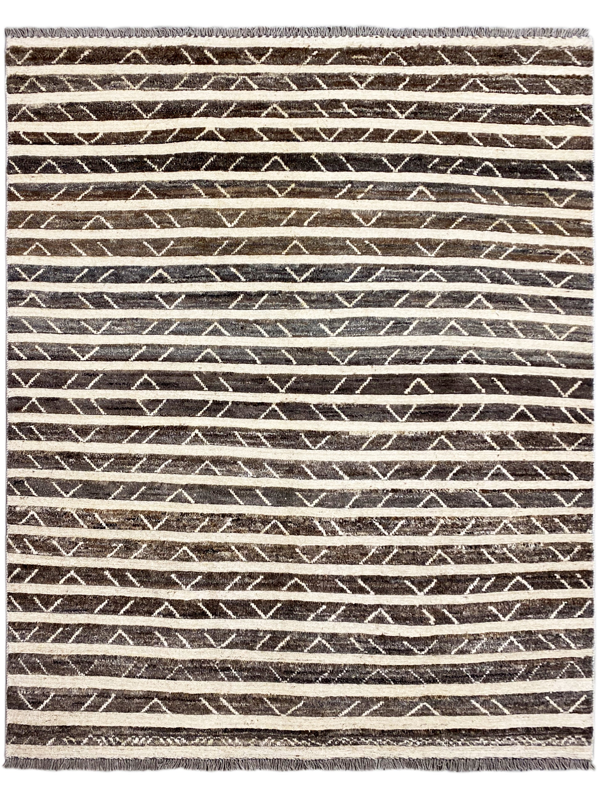 Esta alfombra Kelim Gabbeh tejida a mano, hecha de 100% lana hilada a mano, cautiva con su cálida paleta de colores marrones y finas franjas geométricas que aportan a cualquier espacio una atmósfera moderna y a la vez acogedora. Con un tamaño de 193x150 cm, es ideal para salas de estar o comedores y combina perfectamente con estilos de decoración modernos, bohemios y rústicos. El característico patrón de franjas con sutiles elementos tribales aporta profundidad visual, mientras que la alta calidad de fabricación garantiza durabilidad, resistencia y una sensación agradable y suave al pisar, perfecto para un hogar con estilo y comodidad.