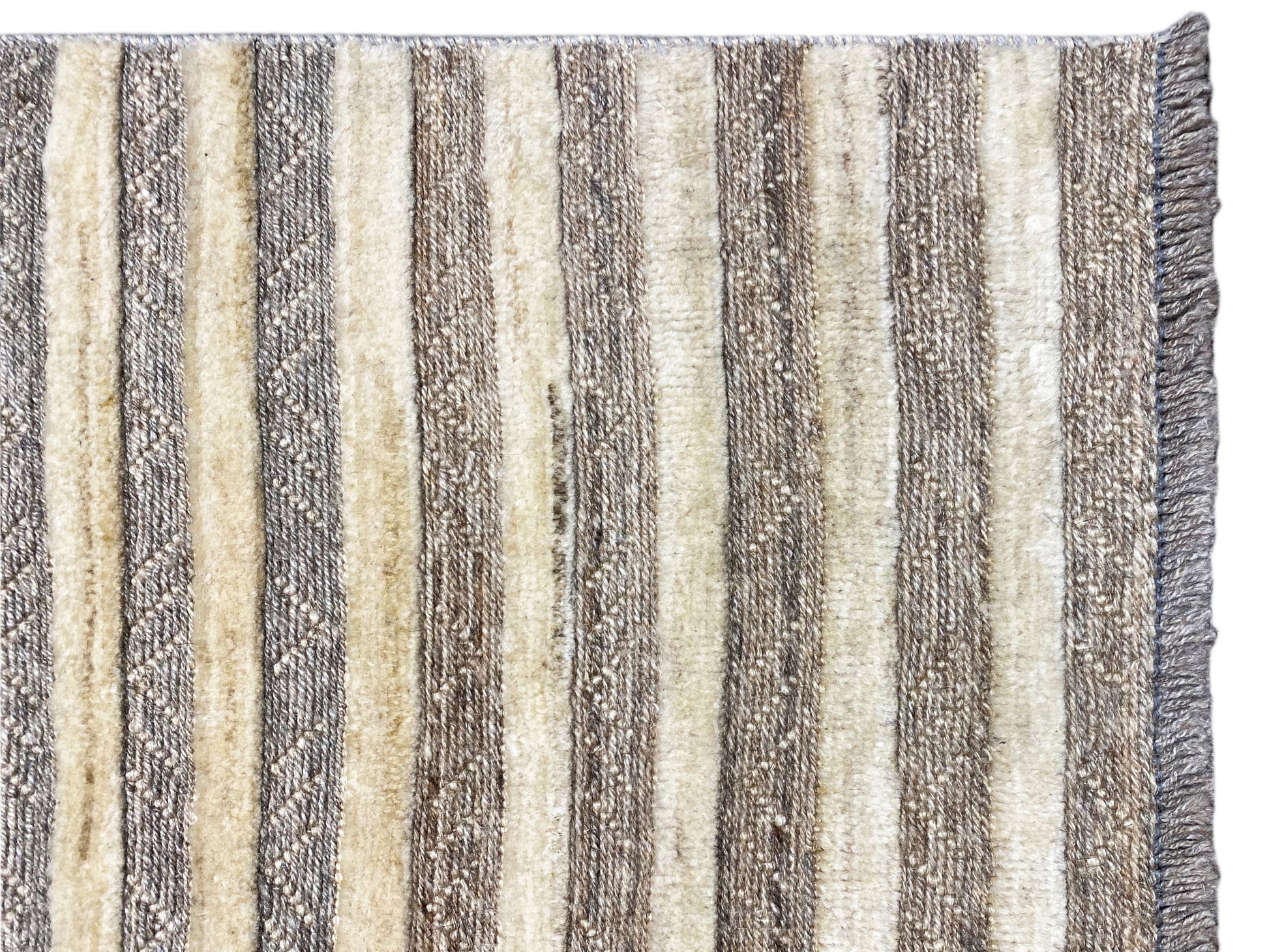Esta alfombra Kelim Gabbeh tejida a mano, hecha de 100 % lana hilada a mano, es un ejemplo perfecto de decoración natural y diseño atemporal. Con unas medidas de 199x138 cm, presenta un delicado patrón de rayas horizontales en tonos grises y beige discretos, que aporta a cualquier espacio una atmósfera tranquila y equilibrada. Su estilo minimalista combina perfectamente con conceptos modernos de vivienda o con el diseño escandinavo, y gracias a la lana natural de alta calidad ofrece una experiencia especialmente agradable y cálida al tacto. Su fabricación resistente convierte esta pieza única en un acompañante duradero para zonas de mucho uso, mientras que los colores orgánicos irradian una elegancia acogedora. Confíe en la artesanía auténtica que une estética y selección ecológica de materiales al más alto nivel.