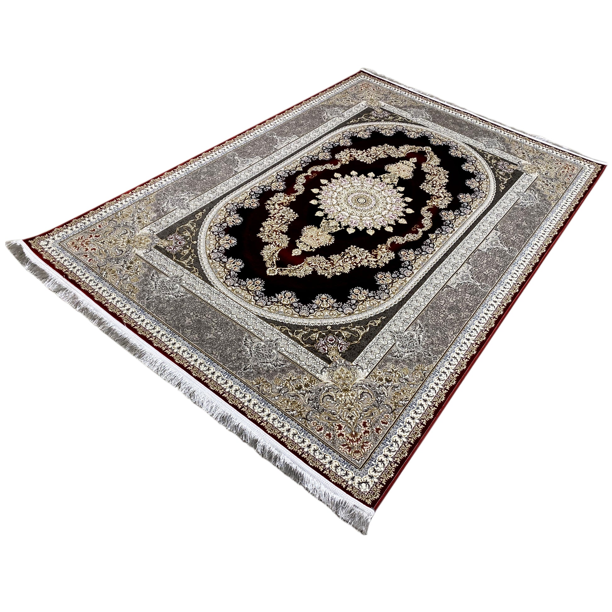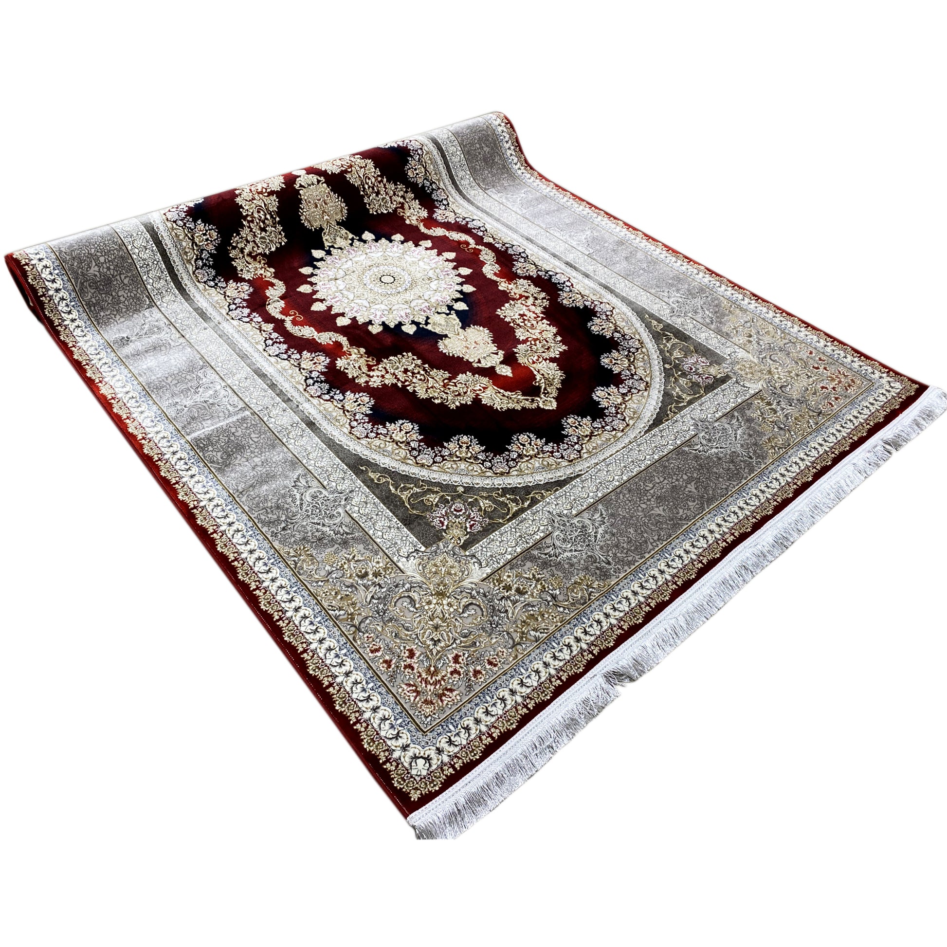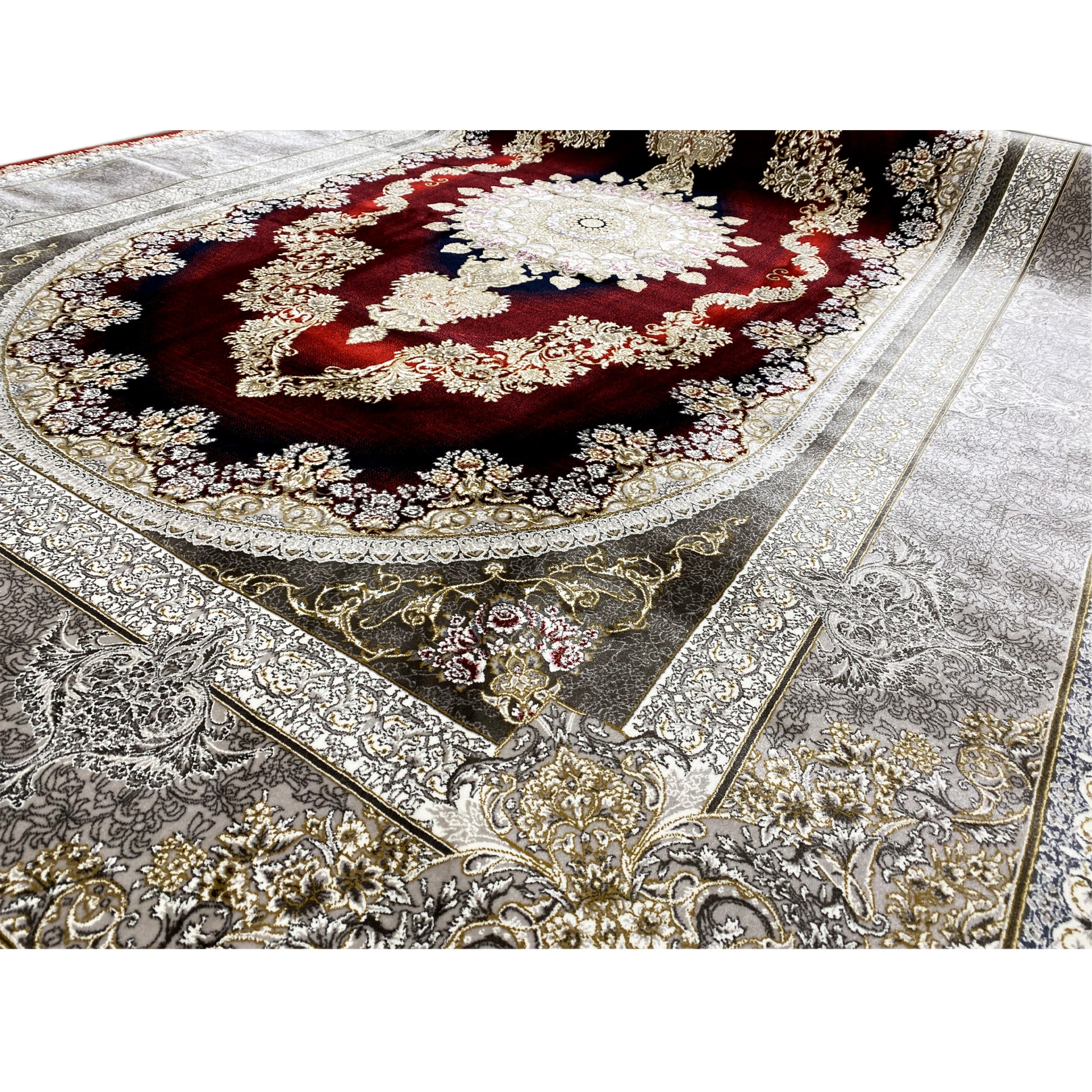 Dale a tu hogar una elegancia opulenta con esta hermosa alfombra clásica. Su distintivo diseño ovalado de medallón presenta un patrón artístico en tonos profundos de rojo y dorado, enmarcado por un refinado borde plateado. Fabricada con 100% acrílico tratado térmicamente, esta alfombra suave y duradera es ideal para áreas de alto tránsito y combina un estilo lujoso con una resistencia moderna. El tamaño generoso de 170x240cm la convierte en la pieza perfecta para destacar en tu sala de estar o comedor.