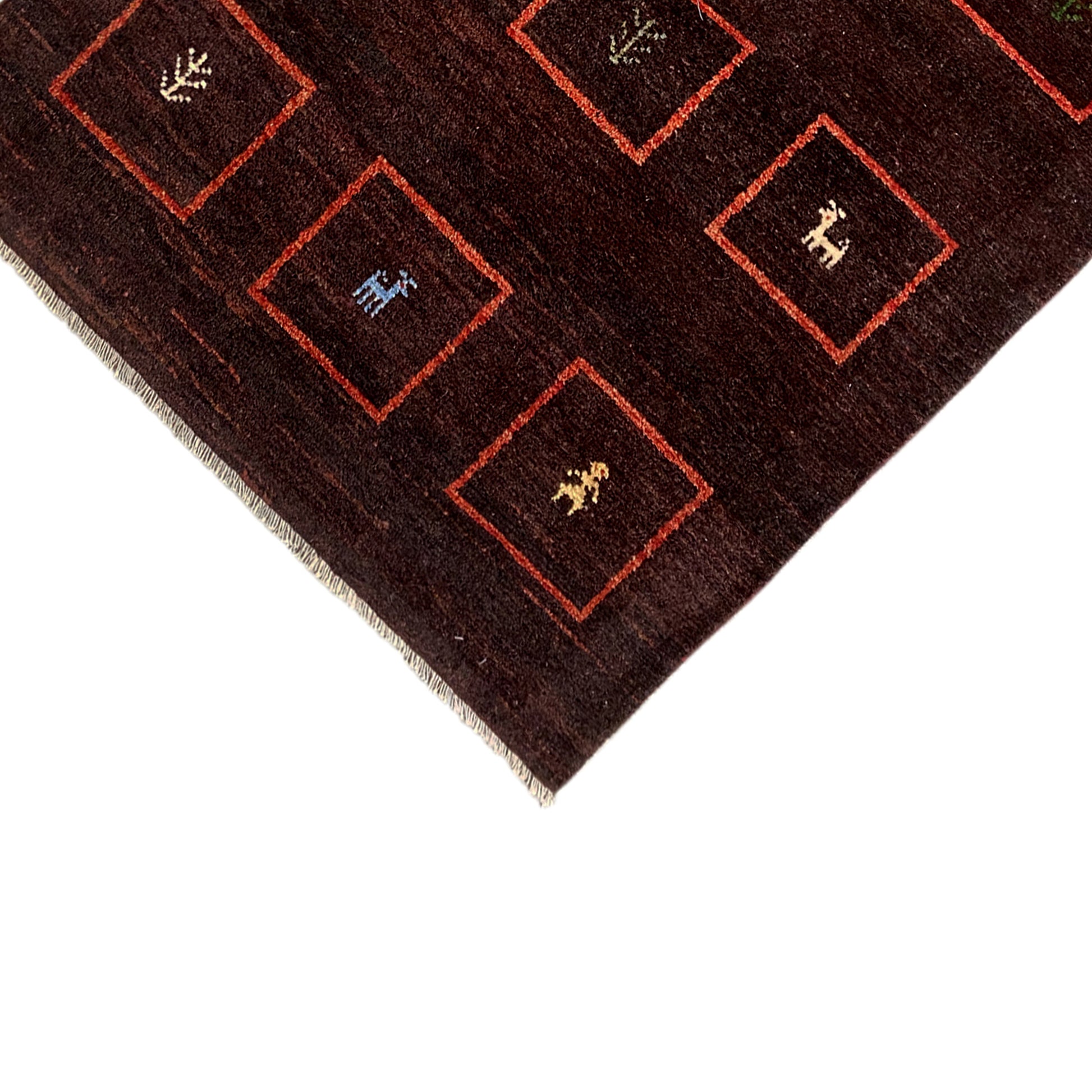 Esta alfombra Gabbeh expresiva y hecha a mano, de 147x99cm, está confeccionada con lana hilada a mano y teñida con plantas, destacando un marrón profundo como color principal. Su patrón tradicional de cuadrícula presenta en cada cuadrado rojo motivos únicos y estilizados de animales y figuras que cuentan una historia. Esta alfombra aporta un calor auténtico y un encanto rústico y tribal a cualquier hogar, siendo una pieza única y duradera.