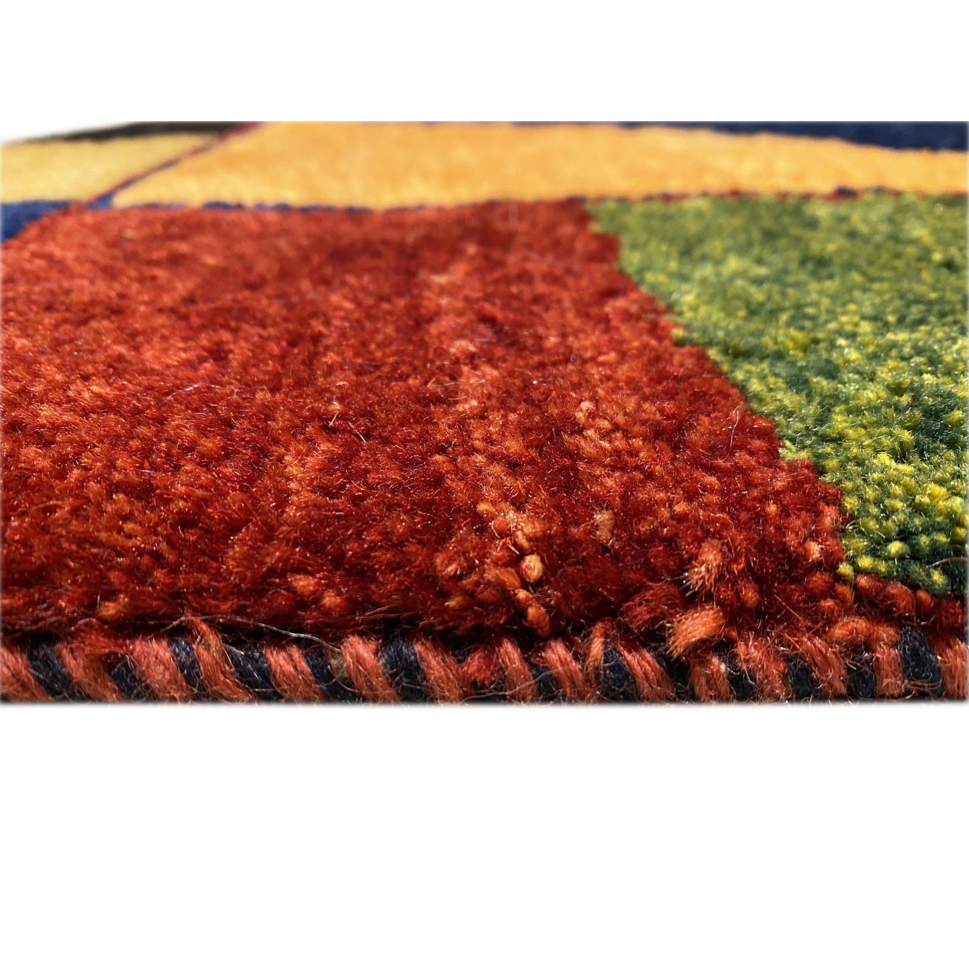 Esta alfombra Gabbeh tejida a mano de tamaño 164x114cm, fabricada con lana hilada a mano y teñida con plantas, aporta un toque natural y rústico a su hogar. El diseño minimalista con un patrón central de rombos y colores vivos la convierte en un elemento versátil para estilos de decoración modernos y tradicionales, que aporta calidez y carácter.
