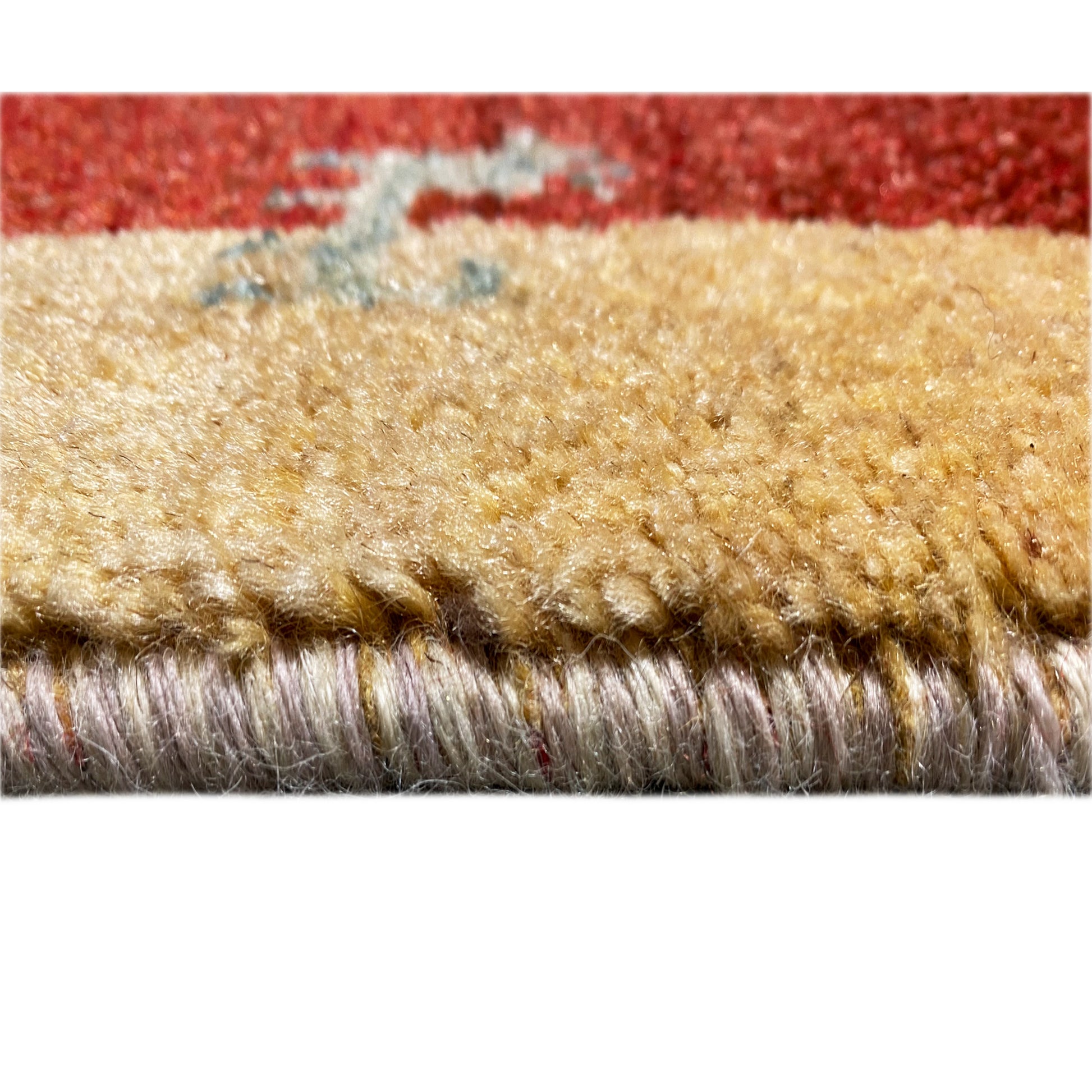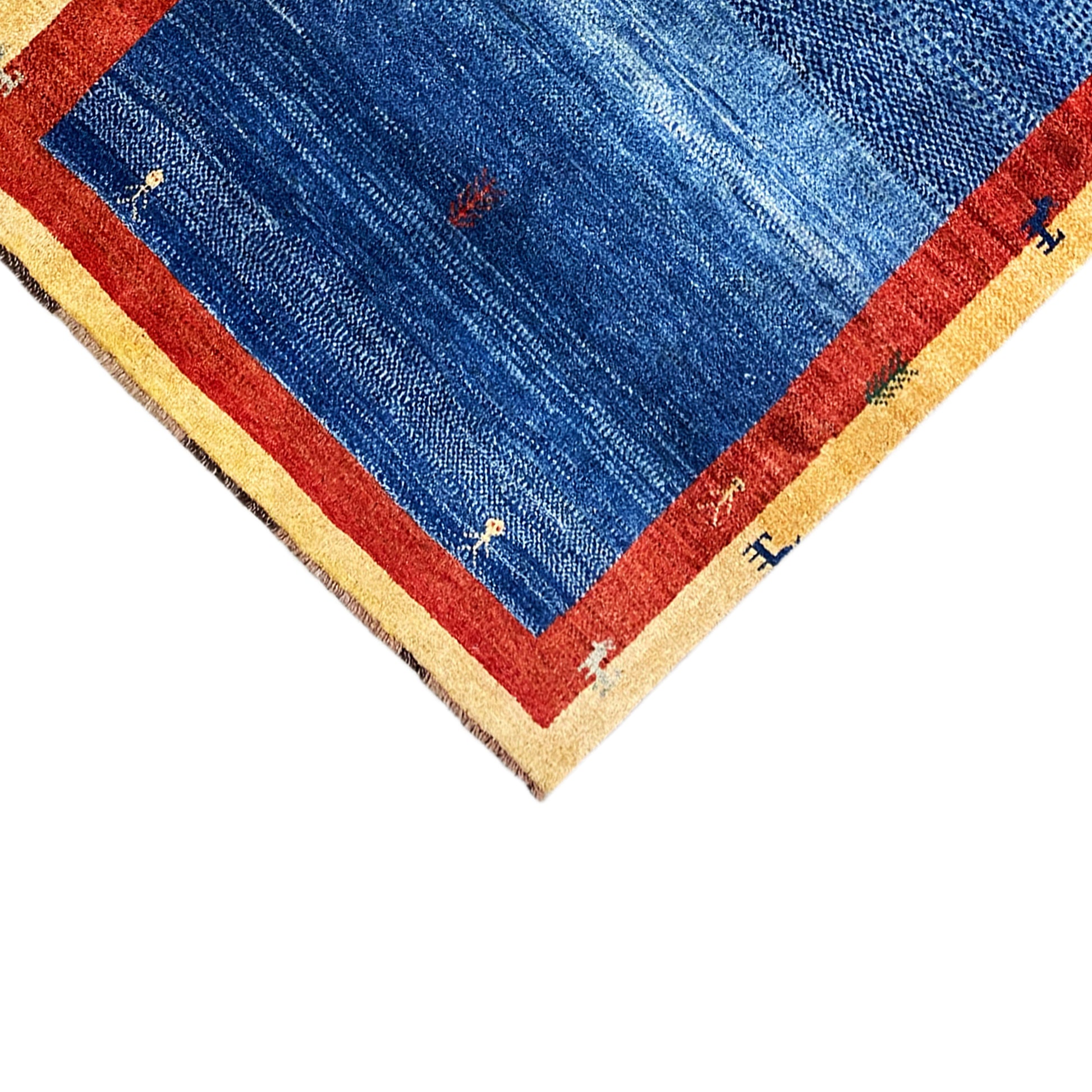 Esta alfombra Gabbeh expresiva y anudada a mano, hecha de lana hilada a mano y teñida con plantas, presenta un centro azul profundo rodeado por un borde interior rojo llamativo y un borde exterior amarillo ancho con figuras estilizadas. Con sus medidas de 192x120 cm, es una pieza versátil que aporta a cualquier espacio, desde lo tradicional hasta lo moderno, una atmósfera vibrante y a la vez conectada con la tierra. La combinación de la artesanía tradicional, los colores brillantes y el patrón figurativo único hace que esta alfombra sea un punto focal especial que despierta interés visual y proporciona confort.