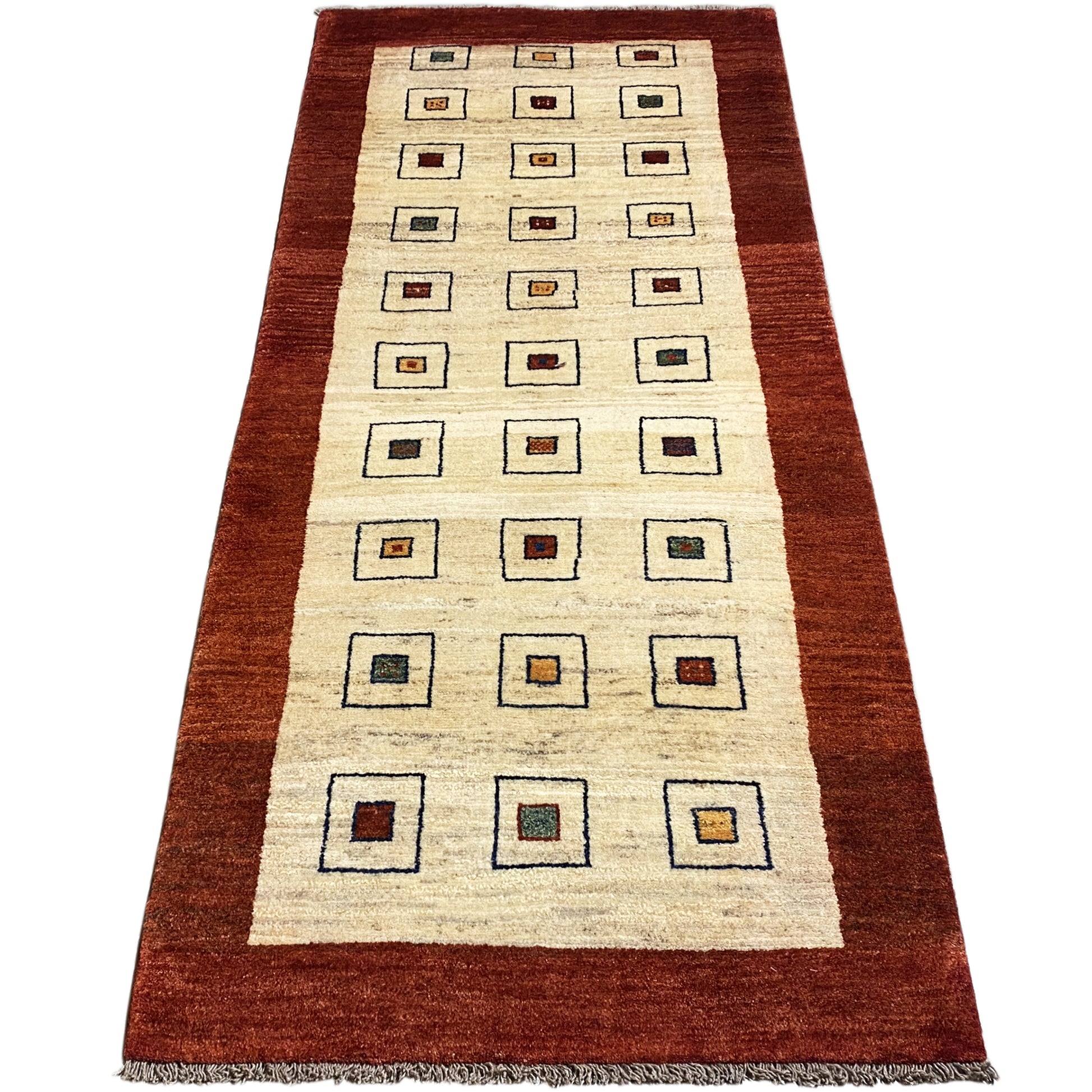 Este único corredor Gabbeh hecho a mano, de 195x84cm, está fabricado con lana hilada a mano y teñida con plantas. Su diseño presenta un campo en beige natural con una cuadrícula de cuadrados estilizados individuales que contienen pequeños motivos tradicionales, enmarcados por un borde rojo óxido. Perfecto para pasillos y espacios estrechos, este corredor aporta a su hogar un toque de encanto rústico y tribal, proporcionando calidez y comodidad natural.