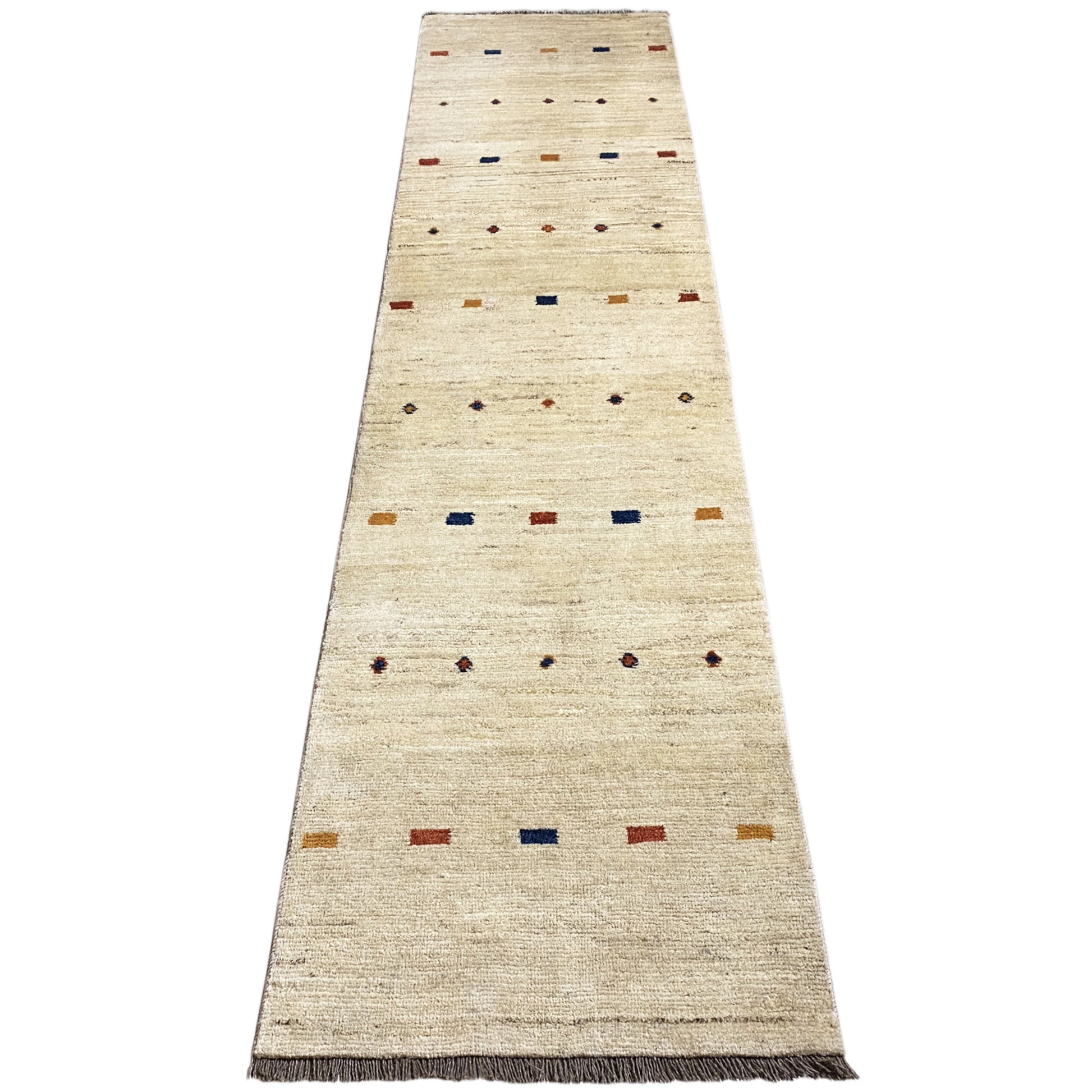 Este impresionante, corredor Gabbeh hecho a mano en el generoso tamaño de 279x69cm, hecho de lana hilada a mano, hecho de lana teñida con plantas. Su diseño minimalista sobre un fondo color beige está realzado por discretos, animado con acentos coloridos en forma de pequeños puntos y motivos horizontales. Ideal para pasillos largos o estilos de decoración minimalistas, este corredor aporta una elegante tranquilidad y calidez natural a su hogar, mientras que al mismo tiempo cautiva con su sencilla belleza.