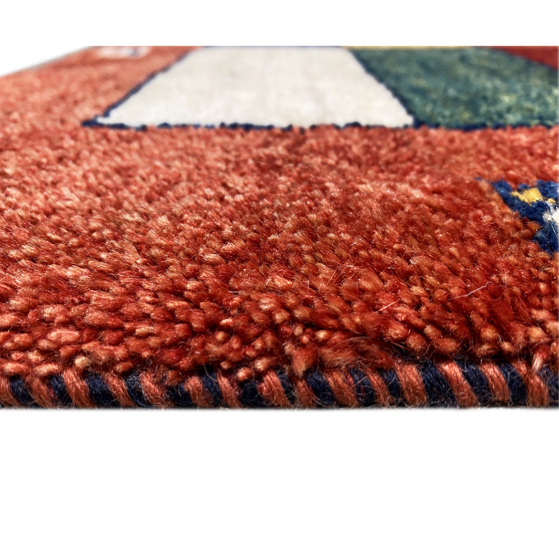 Este corredor Gabbeh hecho a mano y de gran expresividad, de tamaño 139x68cm, está fabricado con lana hilada a mano y teñida con plantas. Su diseño vibrante muestra un patchwork de bloques rectangulares coloridos sobre un fondo rojo dominante, enmarcado por un borde con pequeños símbolos. Ideal para pasillos o espacios estrechos, esta alfombra aporta un acento colorido y dinámico a cualquier estilo de decoración moderno o ecléctico, combinado con la calidez natural y la durabilidad de un auténtico Gabbeh.