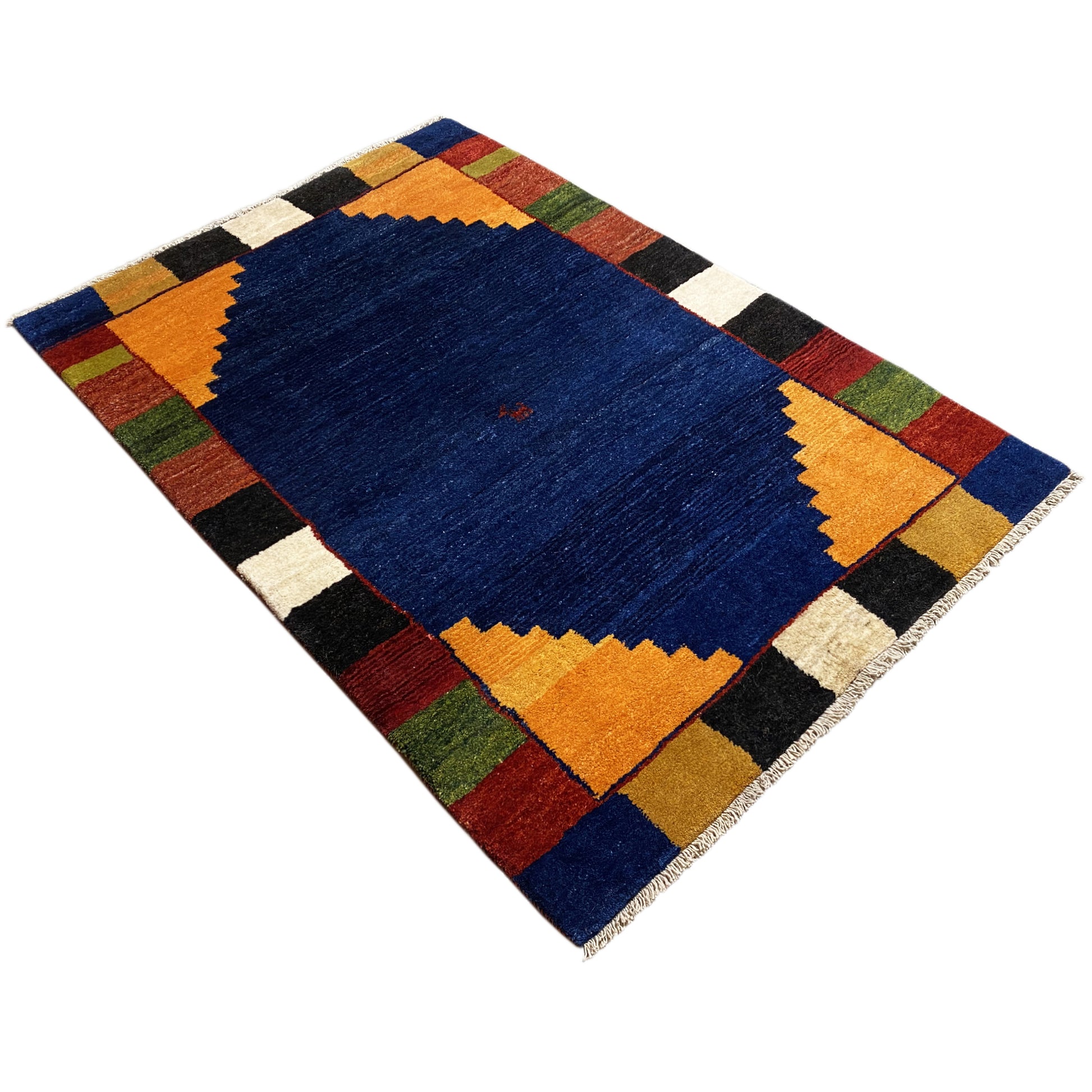 Esta alfombra Gabbeh tejida a mano de tamaño 164x114cm, fabricada con lana hilada a mano y teñida con plantas, aporta un toque natural y rústico a su hogar. El diseño minimalista con un patrón central de rombos y colores vivos la convierte en un elemento versátil para estilos de decoración modernos y tradicionales, que aporta calidez y carácter.