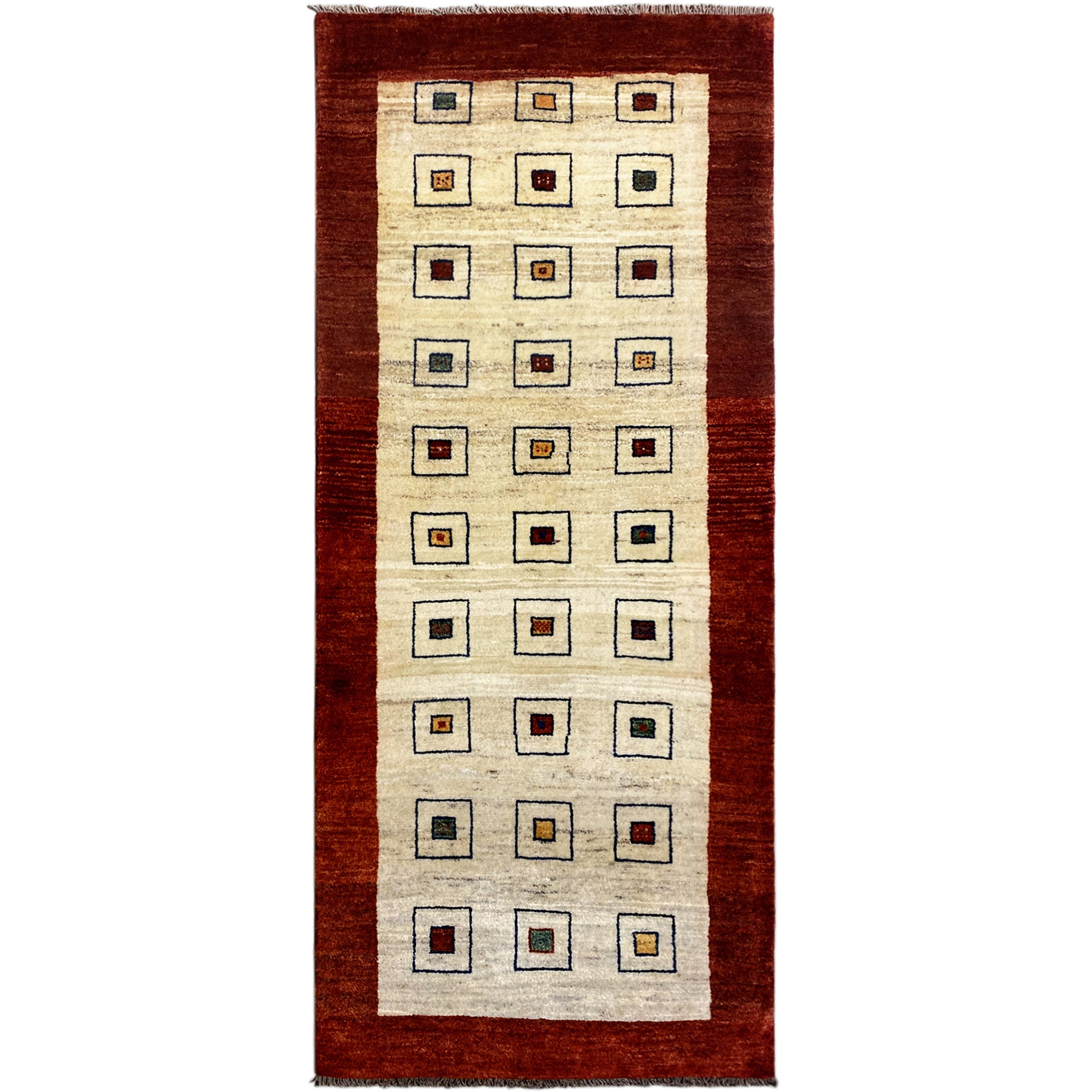 Este único corredor Gabbeh hecho a mano, de 195x84cm, está fabricado con lana hilada a mano y teñida con plantas. Su diseño presenta un campo en beige natural con una cuadrícula de cuadrados estilizados individuales que contienen pequeños motivos tradicionales, enmarcados por un borde rojo óxido. Perfecto para pasillos y espacios estrechos, este corredor aporta a su hogar un toque de encanto rústico y tribal, proporcionando calidez y comodidad natural.