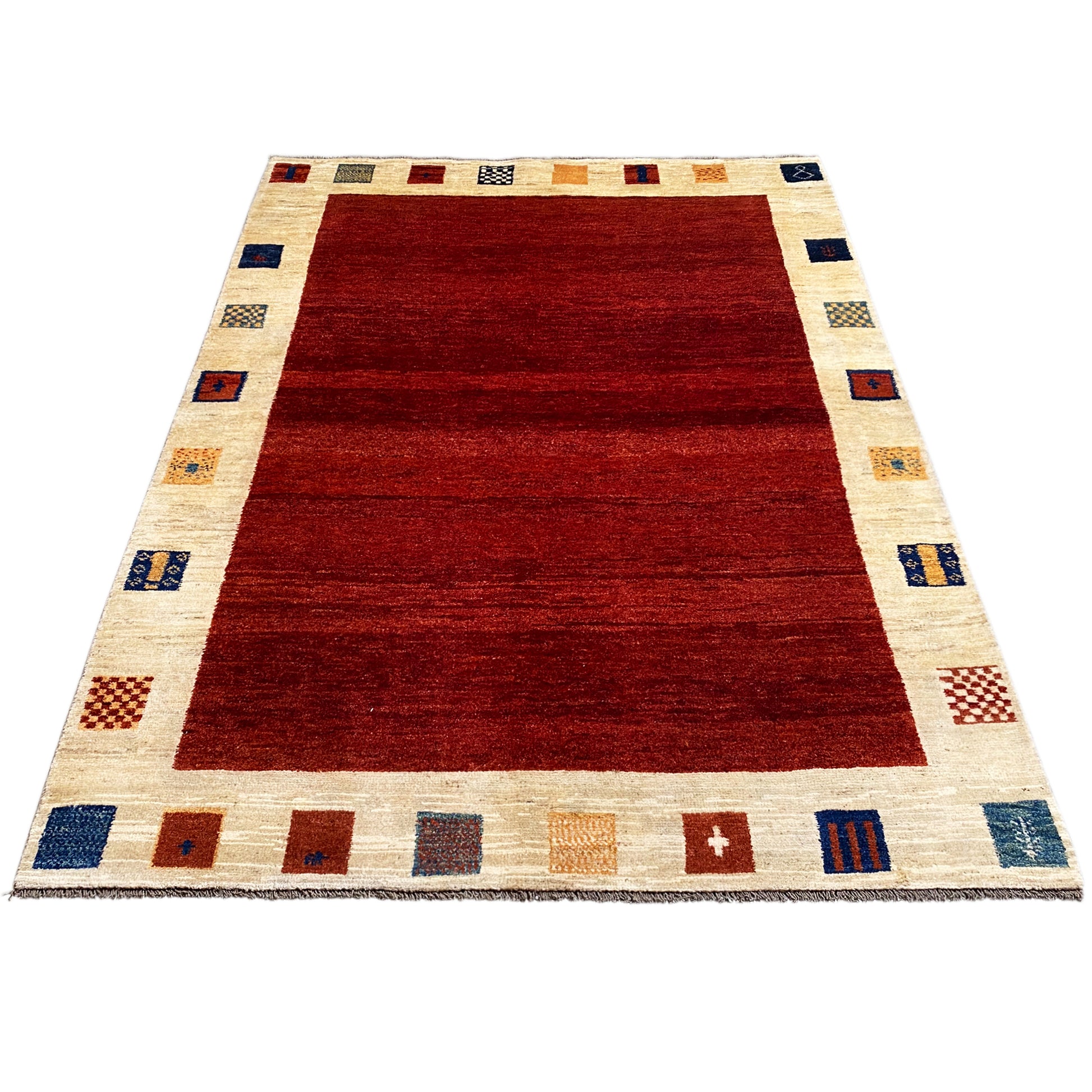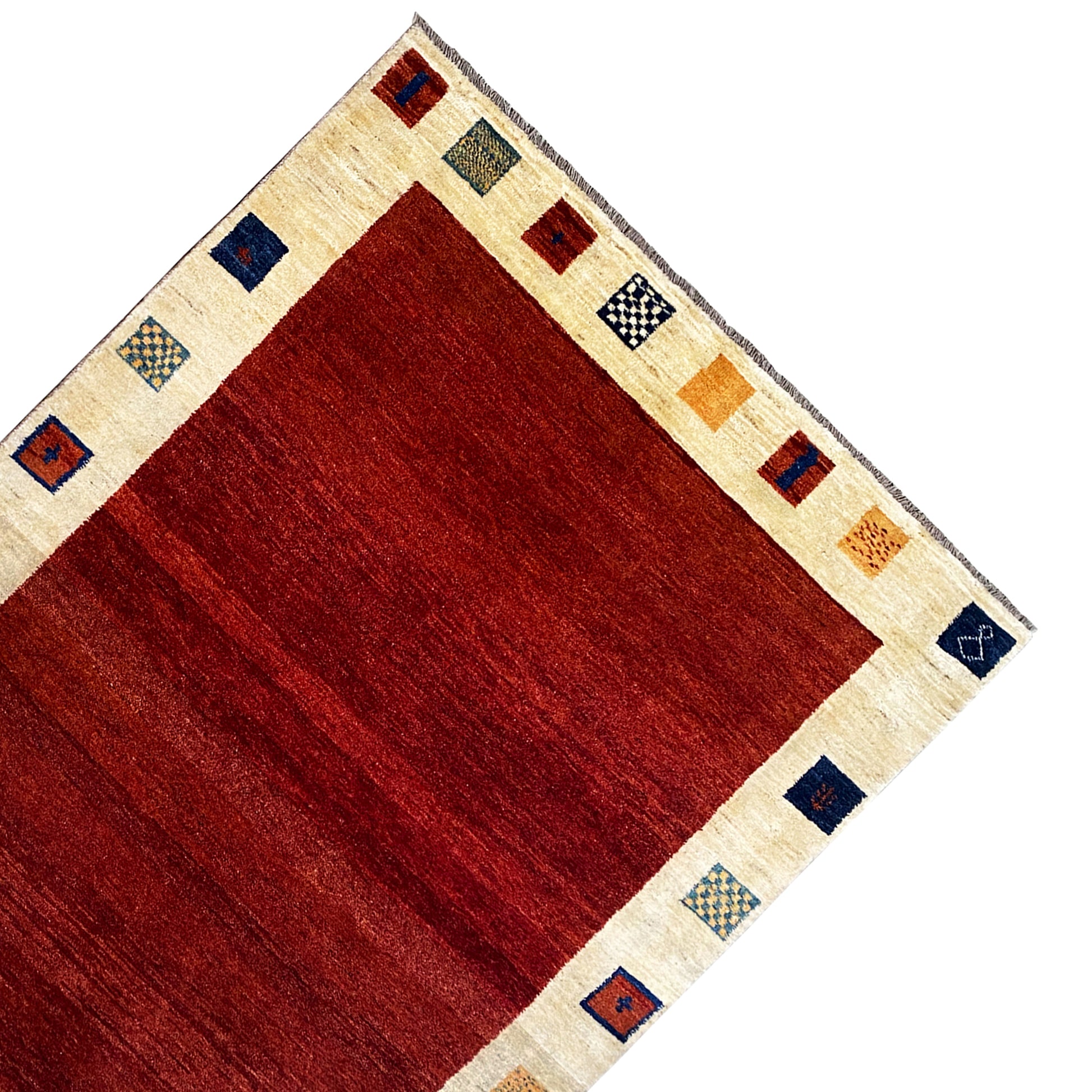 Esta magnífica alfombra Gabbeh anudada a mano, confeccionada con lana hilada a mano y teñida con plantas, destaca por su cálido rojo en el centro, enmarcado por un borde beige llamativo, acentuado con cuadrados de colores. Con sus generosas dimensiones de 231x164 cm, es una pieza ideal para áreas de estar o comedor y aporta una atmósfera terrosa pero a la vez vibrante a su hogar. El patrón minimalista pero expresivo y la alta calidad del material la convierten en un complemento atemporal para diversos estilos de decoración, desde rústico hasta moderno.