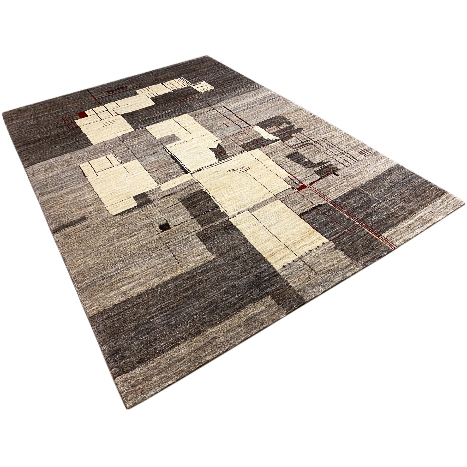 Esta alfombra Gabbeh tejida a mano con lana hilada a mano y teñida con plantas se caracteriza por su estilo decorativo moderno y un patrón abstracto. Con un tamaño de 302x209cm, esta alfombra única en tonos grises ofrece un complemento elegante y duradero que aporta un toque contemporáneo a su espacio vital.