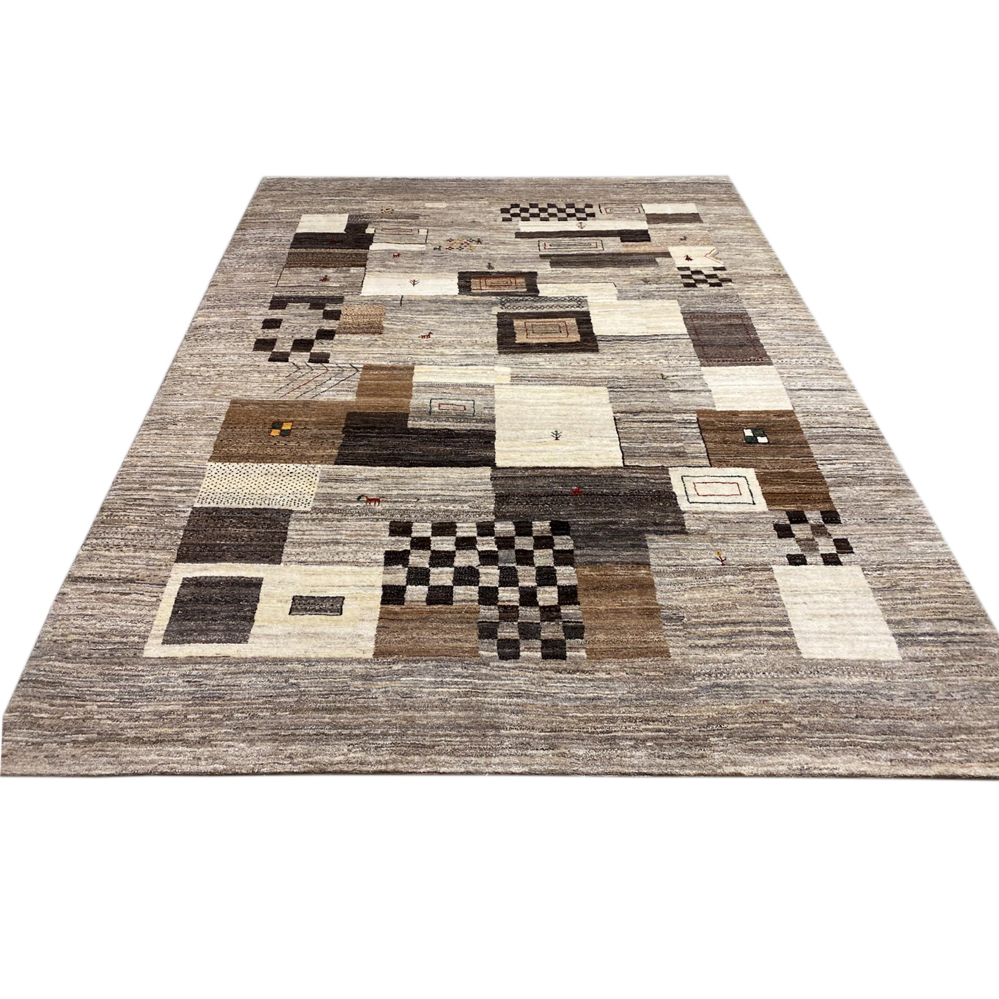 Esta impresionante alfombra Gabbeh tejida a mano con lana hilada a mano y teñida con plantas aporta una belleza natural a su hogar con su estilo decorativo moderno y su fascinante patrón geométrico. Con unas generosas dimensiones de 304x246cm, esta alfombra única en tonos beige es perfecta para dar a cualquier habitación un ambiente cálido y elegante.