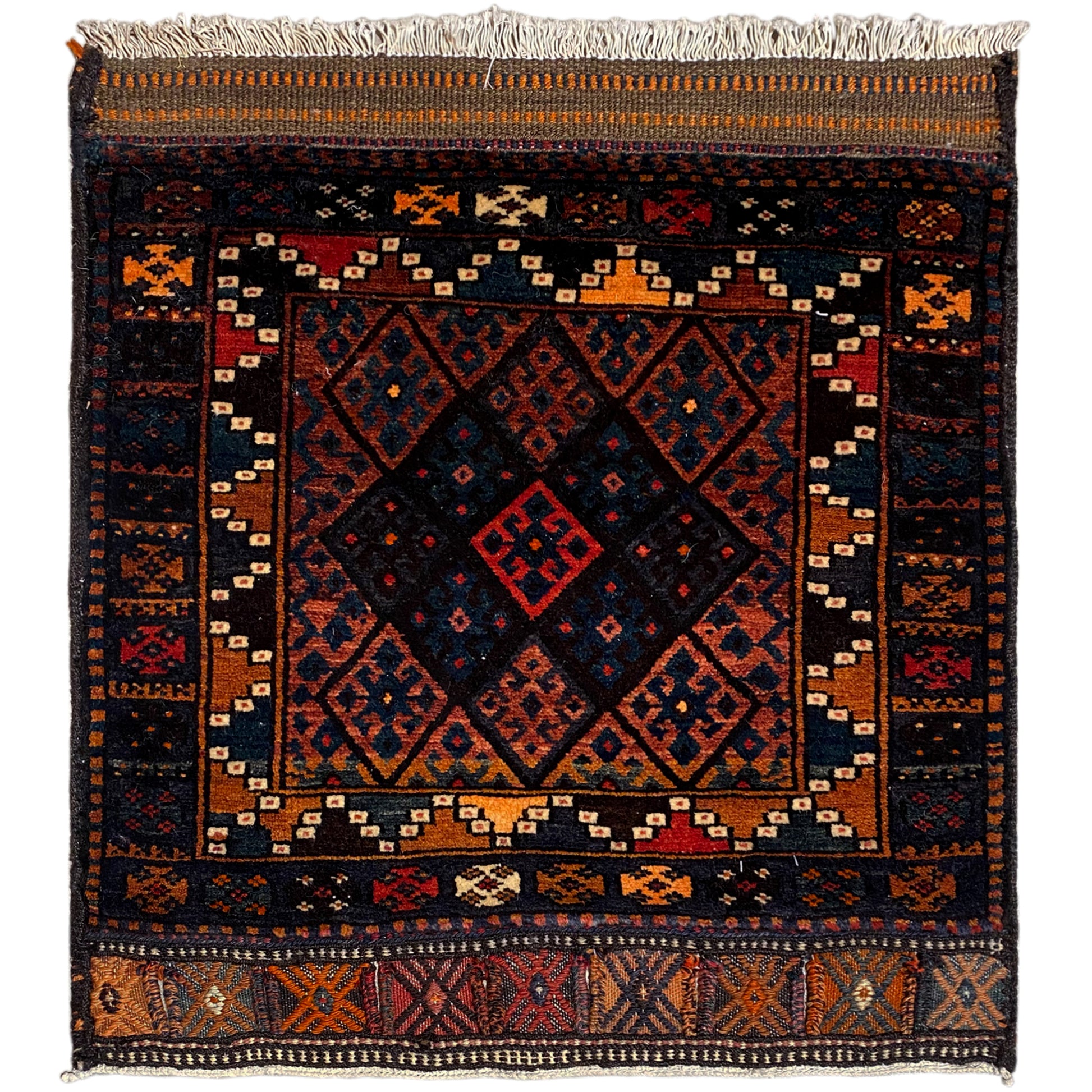 Esta alfombra Poshti Hamedan tejida a mano, hecha de lana y algodón, fascina con su detallado patrón geométrico en un profundo azul marino y acentos cálidos. Con sus medidas de 82x72 cm, esta alfombra es un complemento ideal que aporta a su hogar un ambiente auténtico y acogedor en estilo rústico o tradicional.