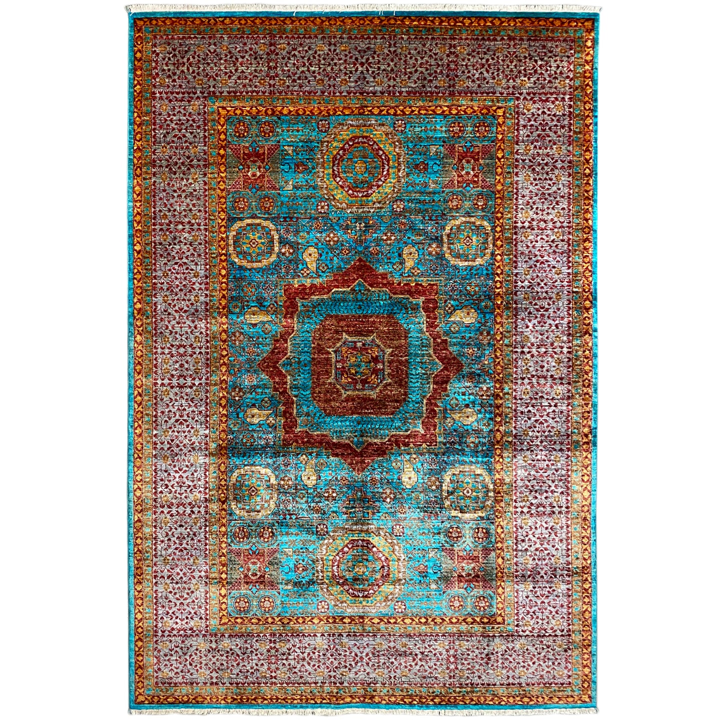Esta alfombra Mamluk anudada a mano (306x209 cm) en un vibrante turquesa con ricos patrones geométricos y florales aporta un toque de elegancia oriental a su hogar. Fabricada con lana hilada a mano de alta calidad, ofrece una textura lujosa y una calidad duradera. El diseño detallado con medallones centrales y bordes artísticos convierte esta alfombra en un punto focal especial. Ideal para la sala de estar o el comedor, esta alfombra se integra perfectamente en diversos estilos de decoración y aporta a cualquier espacio un toque de encanto tradicional y color vibrante.