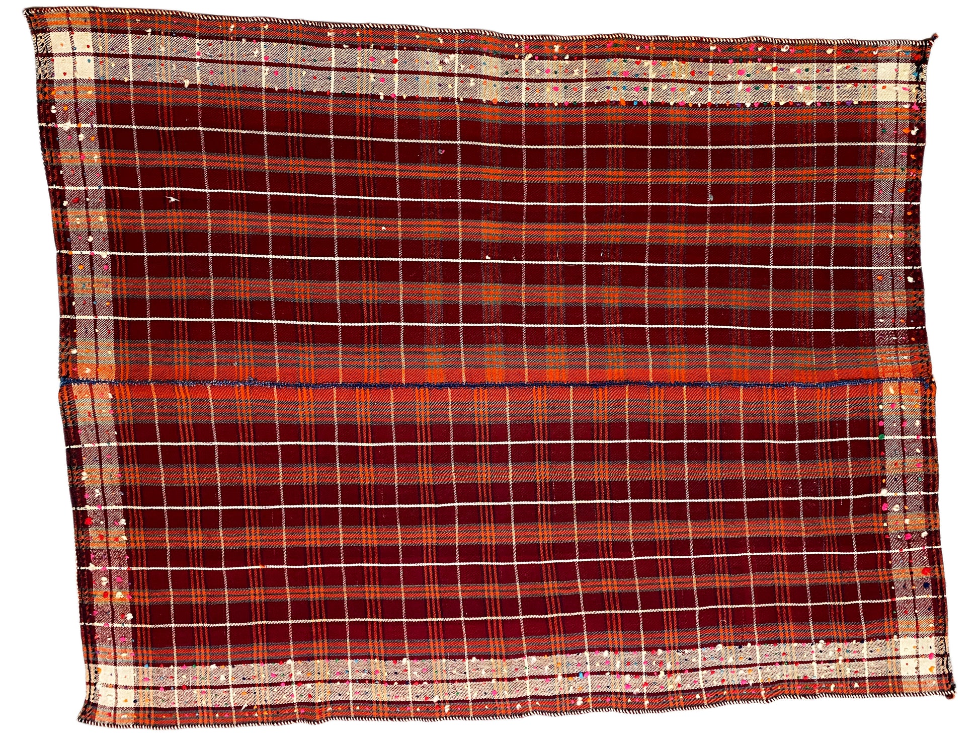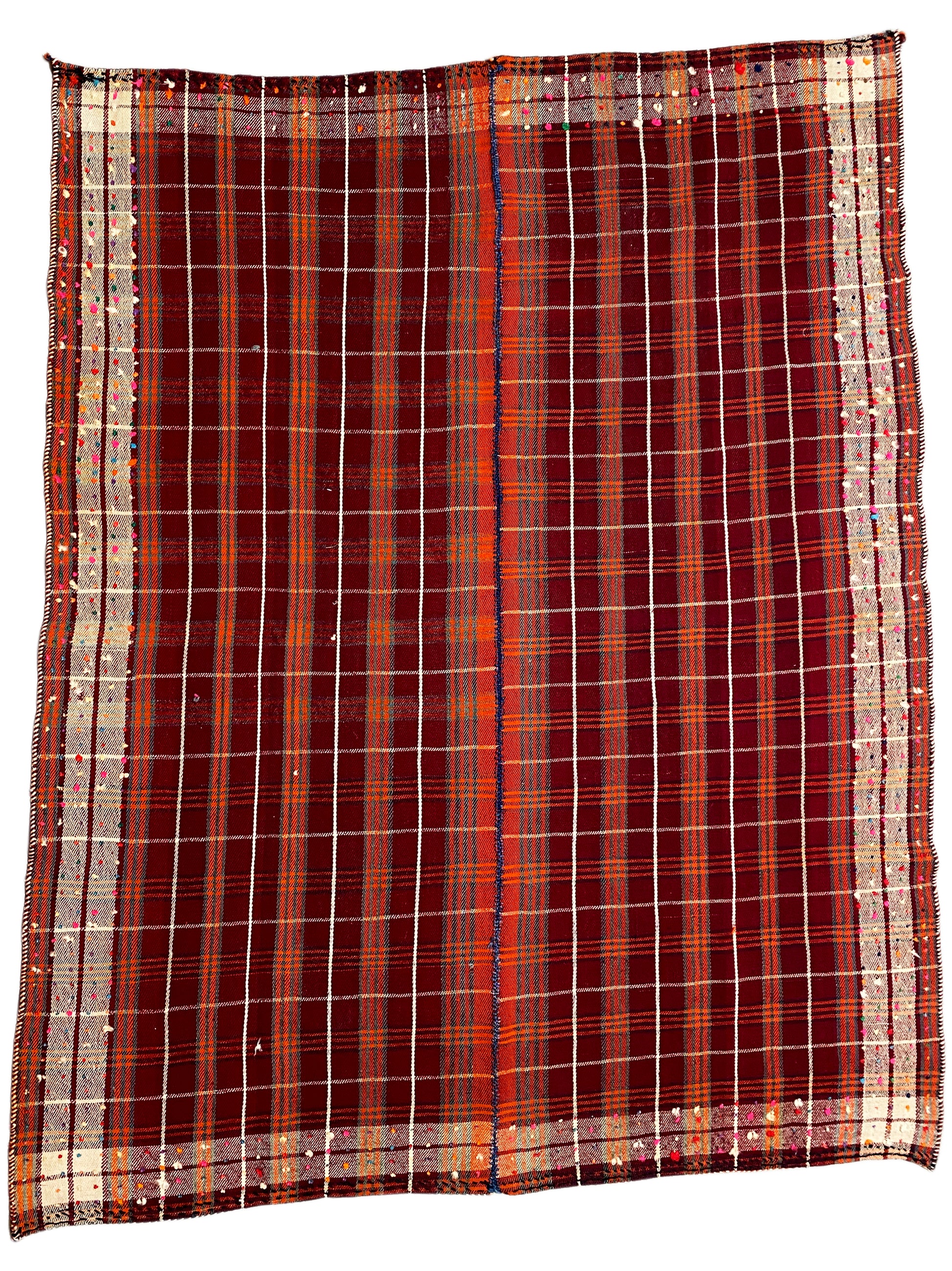 Dieser Jajim wurde von nomadischen Webern auf einem traditionellen Horizontalwebstuhl gefertigt. Leichte Formunregelmäßigkeiten gehören zu seiner Authentizität und zeugen von echter Stammeskunst – jedes Stück ein Unikat mit Seele, Geschichte und Persönlichkeit. Ein maschinell gefertigter Teppich kann perfekt symmetrisch sein – doch nur ein handgewebter Jajim wie dieser trägt die einzigartige Handschrift seines Webers in sich.