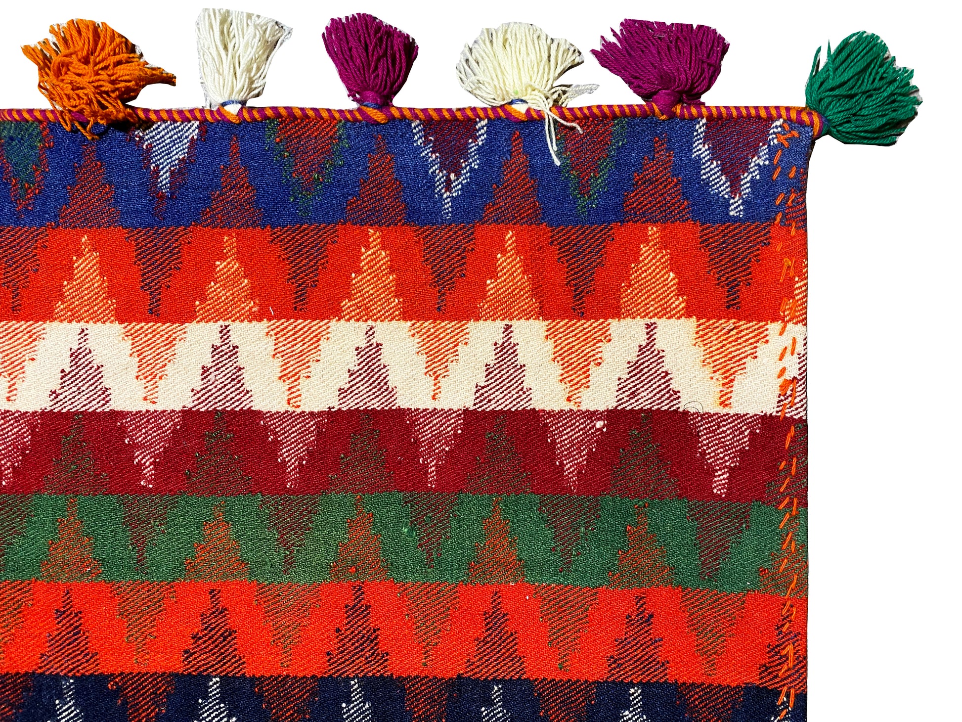 Dieser exquisite handgewebte Jajim Teppich aus handgesponnener Wolle ist ein dynamischer Blickfang im Ethno-Stil. Mit einer Größe von 236x156 cm eignet er sich ideal für Wohnzimmer oder größere Flure. Das Design besticht durch ein auffälliges, vertikales Zickzack-Muster, das in kontrastreichen Streifen aus tiefem Rot, Blau, Orange, Grün und Weiß angeordnet ist. Als authentisches Unikat unterstreicht dieser Wollteppich traditionelle Handwerkskunst und bietet eine warme, langlebige und farbenfrohe Ergänzung, die Ihrem Zuhause sofort Charakter verleiht.