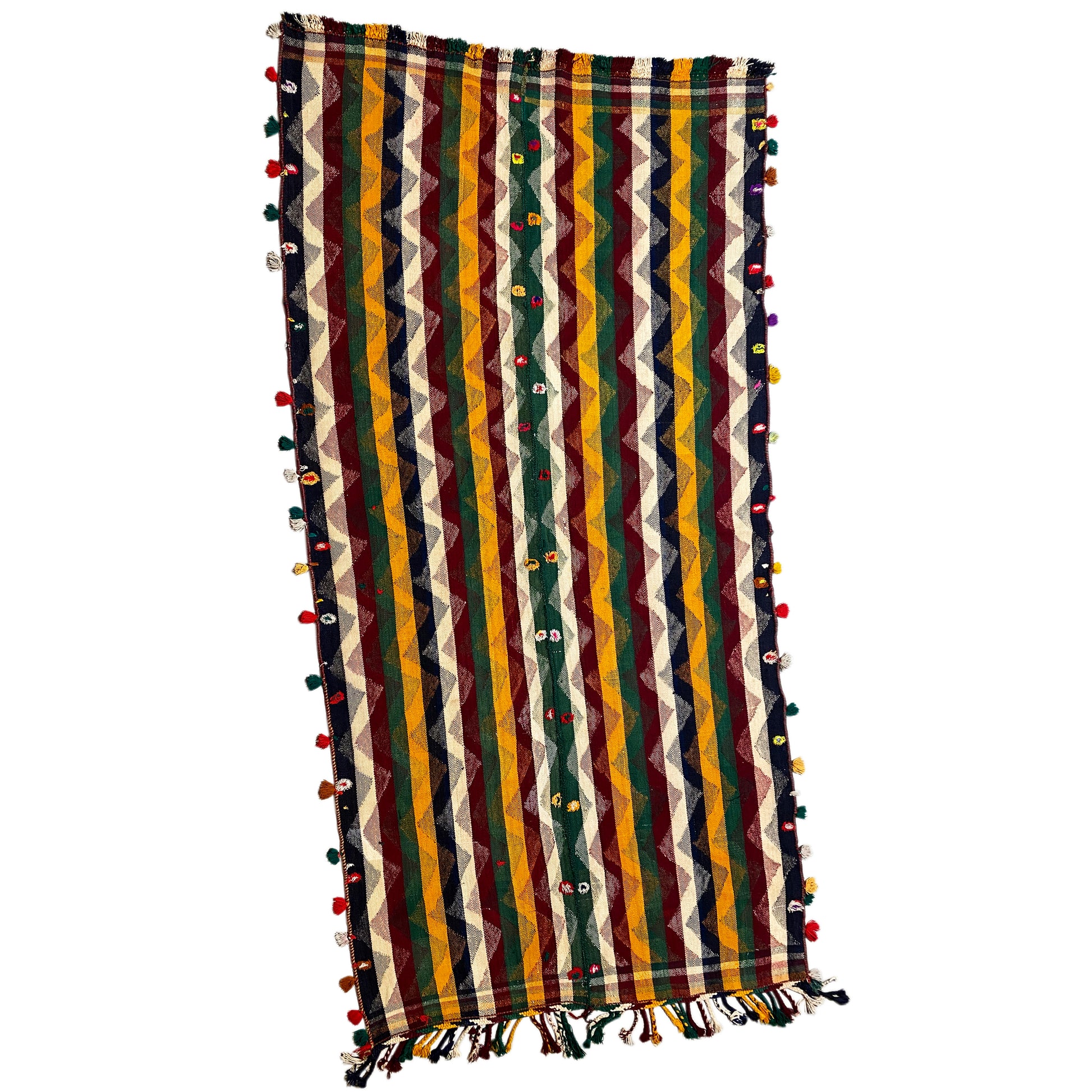 Dieser handgewebte Jajim Teppich aus handgesponnener Wolle verbindet ein farbenfrohes geometrisches Zickzackmuster mit traditionellen Details und eignet sich dank seiner Größe von 255x124 cm perfekt für Wohn-, Schlaf- oder Essbereiche im Boho-Dekor-Stil; die intensiven Streifen in Grün, Rot, Blau, Gelb und Creme verleihen jedem Raum Wärme und Charakter, während die robuste Wollqualität und die authentische Webtechnik für Langlebigkeit, Komfort und zeitlose Ausstrahlung sorgen.