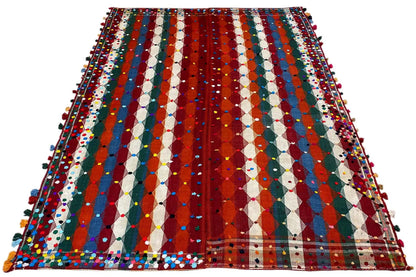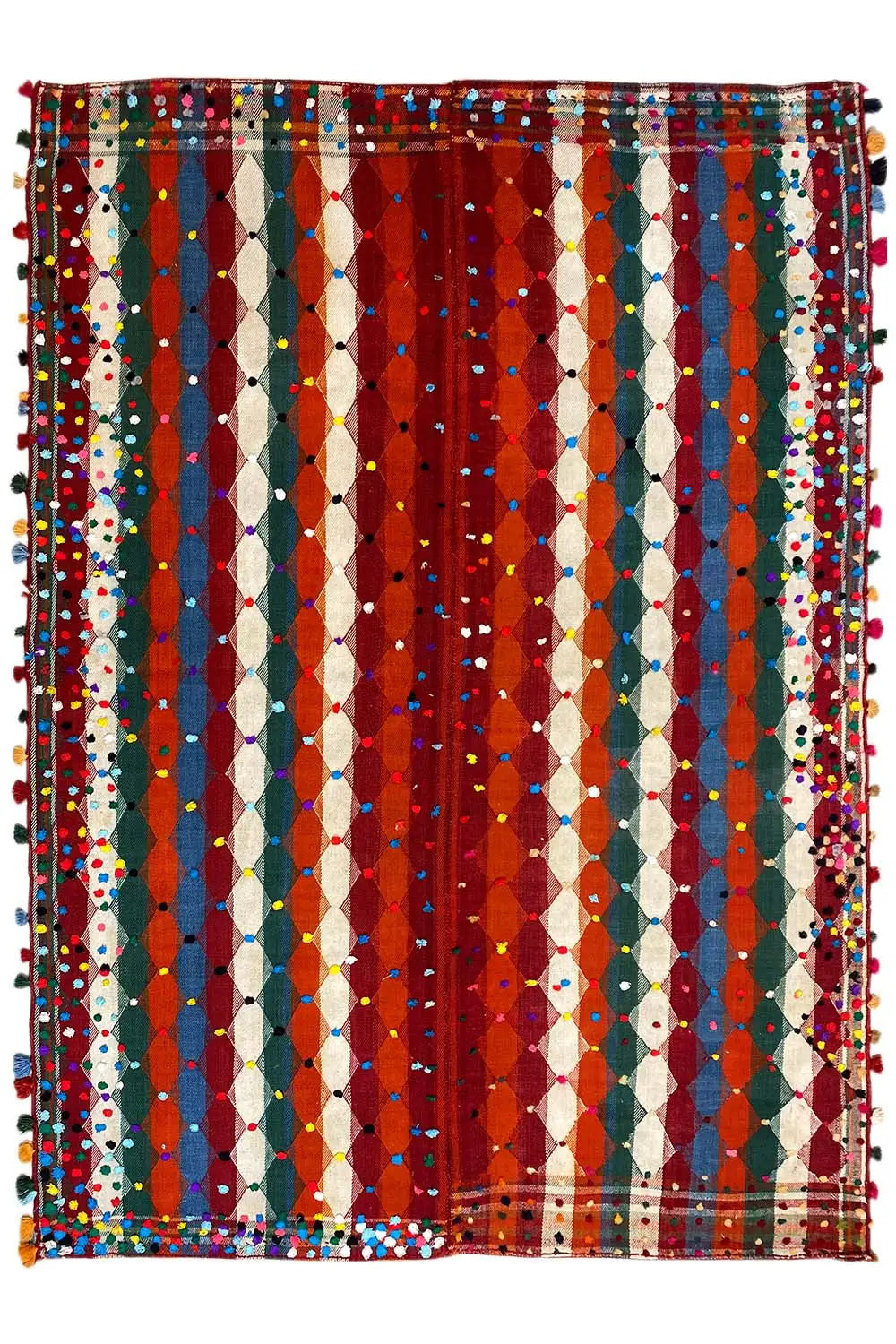 Los Jajim son conocidos principalmente por su singular intensidad de color y calidad. Esto se logra mediante procesos naturales de teñido con plantas. A diferencia de nuestras otras alfombras, los Jajim se tejen y no se anudan. Este proceso de fabricación hace que el Jajim sea muy plano. Este método de producción también es una tradición nómada de siglos de antigüedad. Los nómadas no solo usaban las alfombras tejidas terminadas como decoración de suelo, sino también, entre otras cosas, como decoración de paredes o como material para fabricar tiendas. Técnicas especiales de procesamiento y colores naturales obtenidos de plantas le dan a los Kelims un aspecto único.