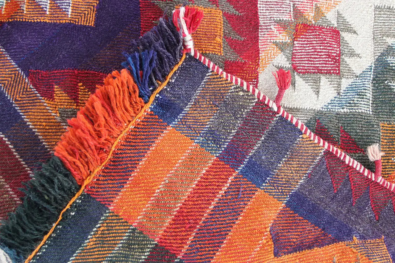 Los Jajim son conocidos principalmente por su singular intensidad de color y calidad. Esto se logra mediante procesos naturales de teñido con plantas. A diferencia de nuestras otras alfombras, los Jajim se tejen y no se anudan. Este proceso de fabricación hace que el Jajim sea muy plano. Este método de producción también es una tradición nómada de siglos de antigüedad. Los nómadas no solo usaban las alfombras tejidas terminadas como decoración de suelo, sino también, entre otras cosas, como decoración de paredes o como material para fabricar tiendas. Técnicas especiales de procesamiento y colores naturales obtenidos de plantas le dan a los Kelims un aspecto único.