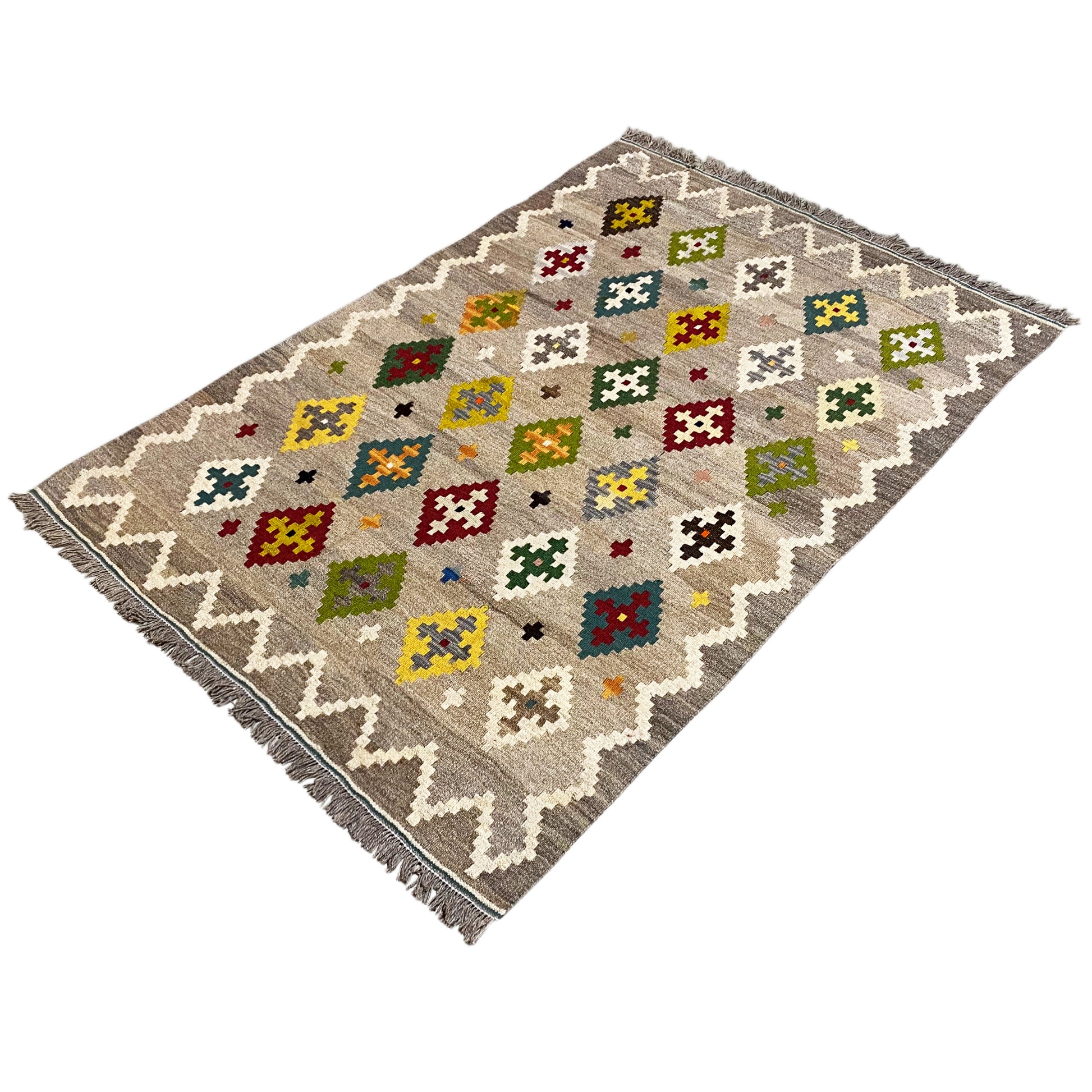 Esta única alfombra Kelim Qashqai tejida a mano con lana hilada a mano aporta a cualquier espacio una atmósfera auténtica, rústica o bohemia. Con sus vivos patrones geométricos de rombos y un tamaño de 146x100 cm, esta resistente alfombra de tejido plano es perfecta para darle a su sala, dormitorio o pasillo un toque de calidez y carácter. Fabricada con lana de alta calidad, ofrece durabilidad y una agradable textura, mientras que su diseño atemporal proporciona una decoración inspiradora.