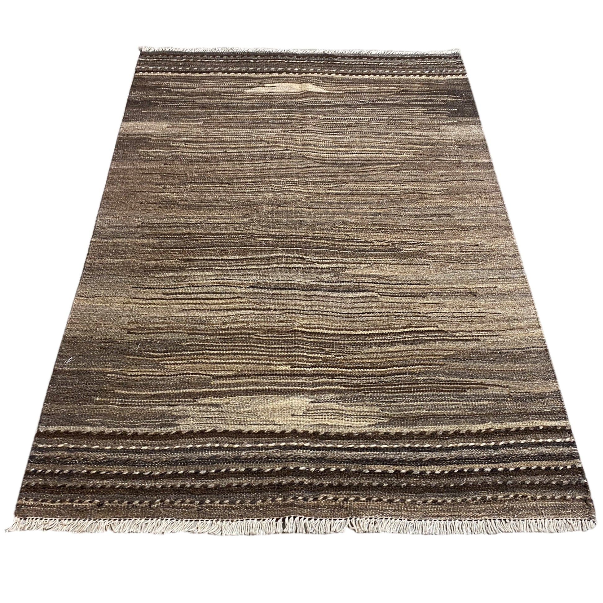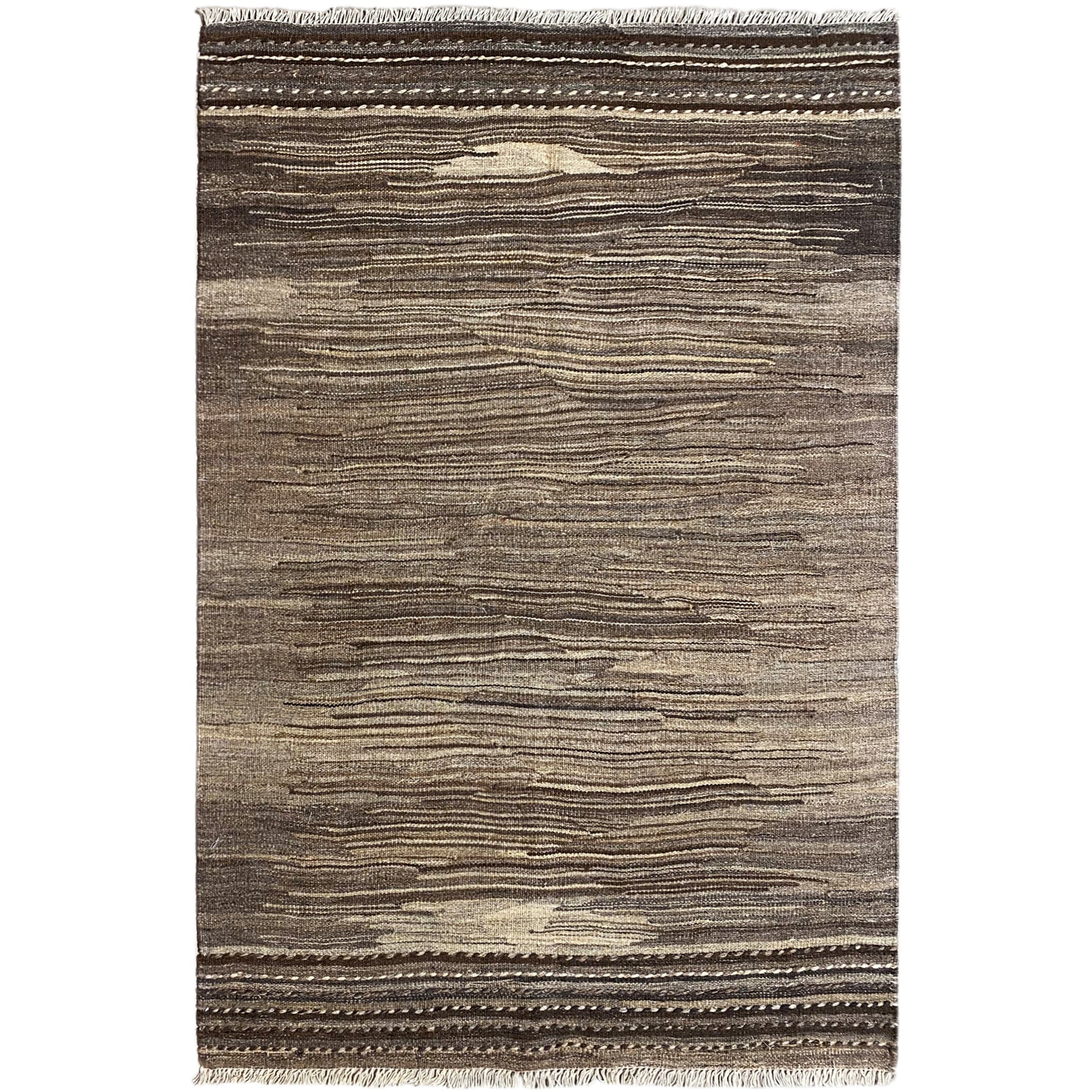 Este único Kelim Qashqai tejido a mano con lana hilada a mano se presenta en tonos marrones y beige relajantes con un patrón sutilmente rayado y abstracto que irradia naturalidad. Con un tamaño de 153x102 cm, esta alfombra de tejido plano resistente es ideal para crear un ambiente acogedor y rústico o también minimalista. Ofrece la auténtica textura y durabilidad de la lana pura, perfecta para pasillos, dormitorios o como un acento en su sala de estar, y es un complemento atemporal para cualquier hogar.