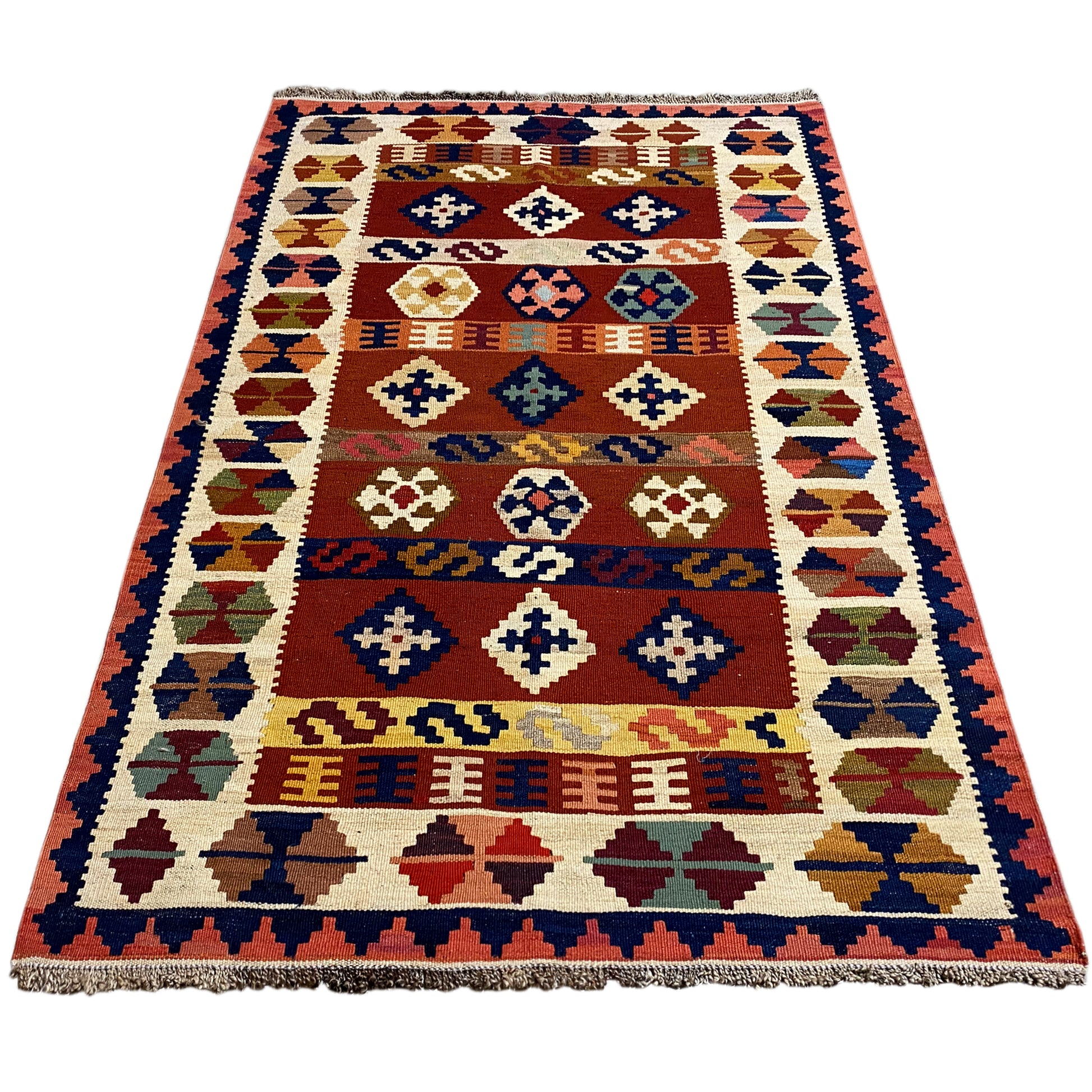Esta alfombra Kelim Qashqai, tejida a mano con lana hilada a mano, se presenta en un diseño vibrante y multicolor con un campo central rojo dominante, rico en patrones geométricos de rombos y tribales. Con un tamaño de 177x118 cm, esta alfombra de tejido plano resistente es ideal para aportar un acento auténtico y colorido a espacios con estilo boho, tribal o tradicional. Destaca por su artesanía detallada, materiales naturales y durabilidad, que aportan calidez y carácter a cualquier hogar.