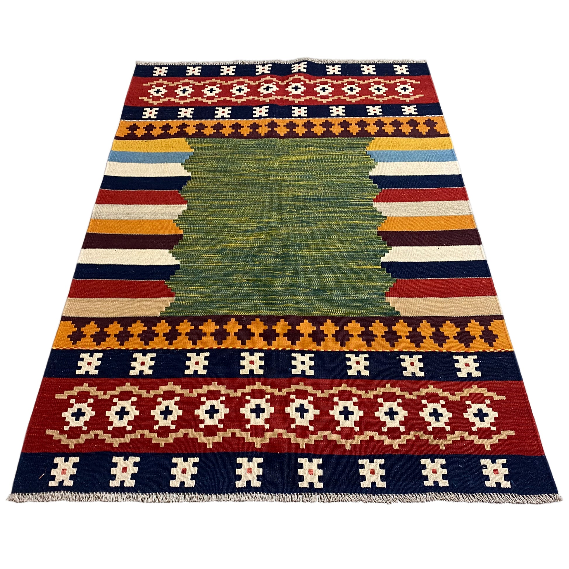 Este vibrante Kelim Qashqai tejido a mano con lana hilada a mano es una obra maestra de la artesanía étnica, que llama la atención de inmediato con su diseño colorido y un tamaño de 178x121 cm. Combina un campo central verde llamativo con bandas circundantes en rojo, azul, amarillo y naranja, decoradas con patrones geométricos tradicionales. Ideal para estilos de decoración bohemia, tribal o ecléctica, esta alfombra plana robusta no solo ofrece un enriquecimiento visual, sino también la textura natural y la durabilidad de la lana pura, que llena cualquier espacio de calidez y personalidad.