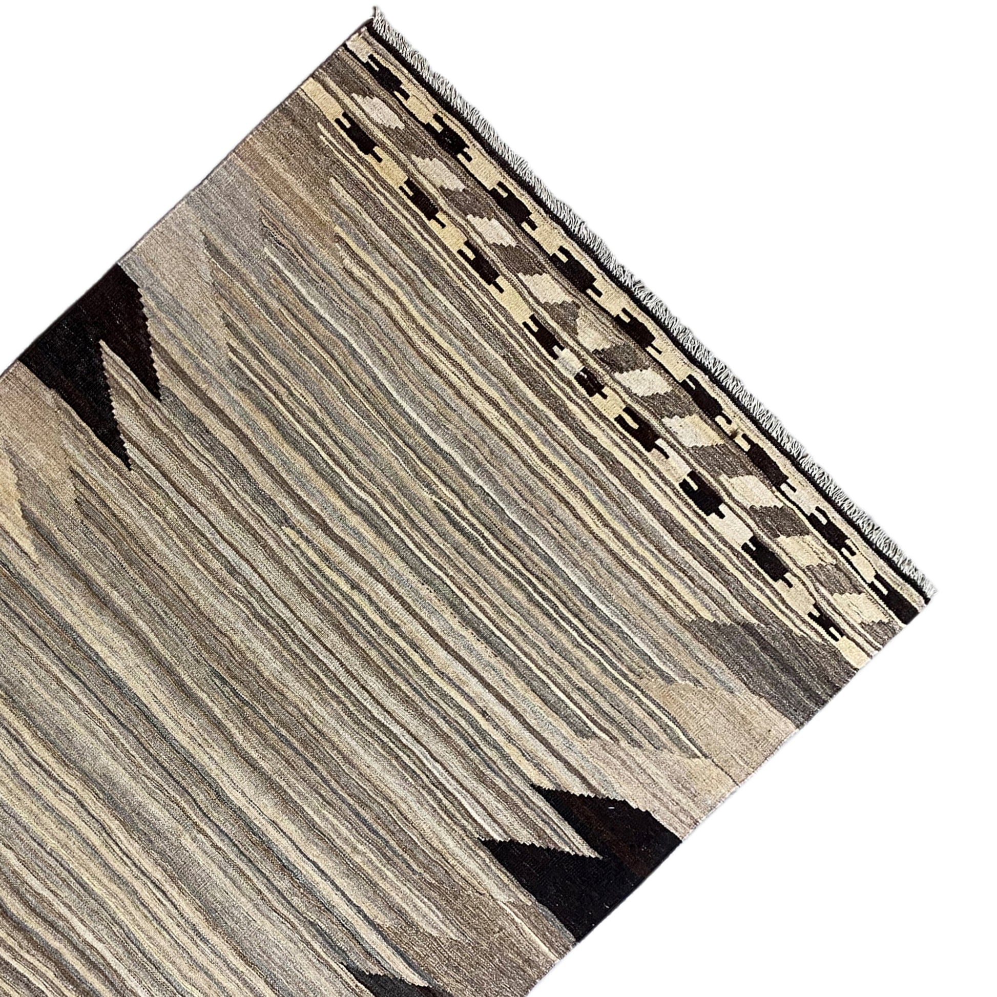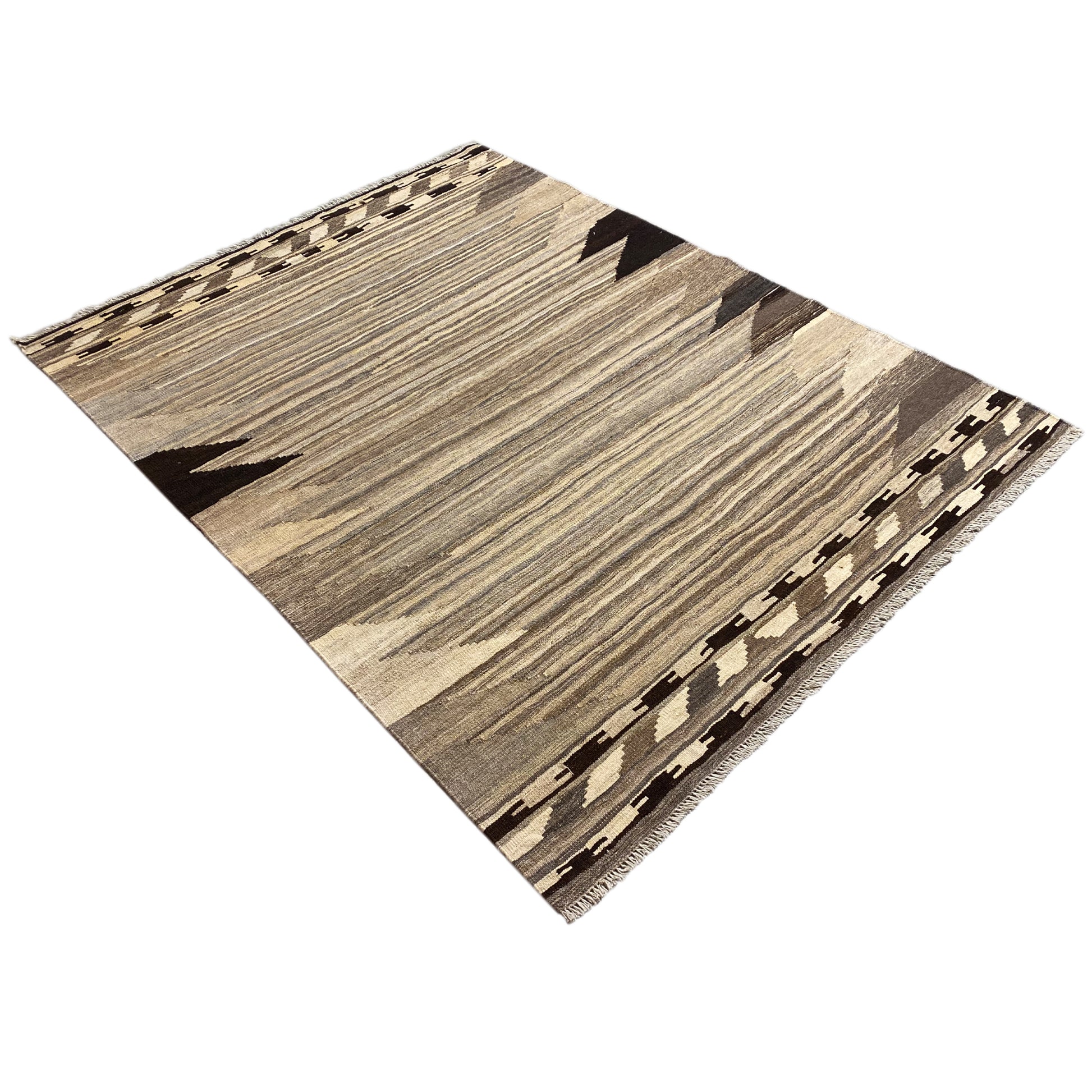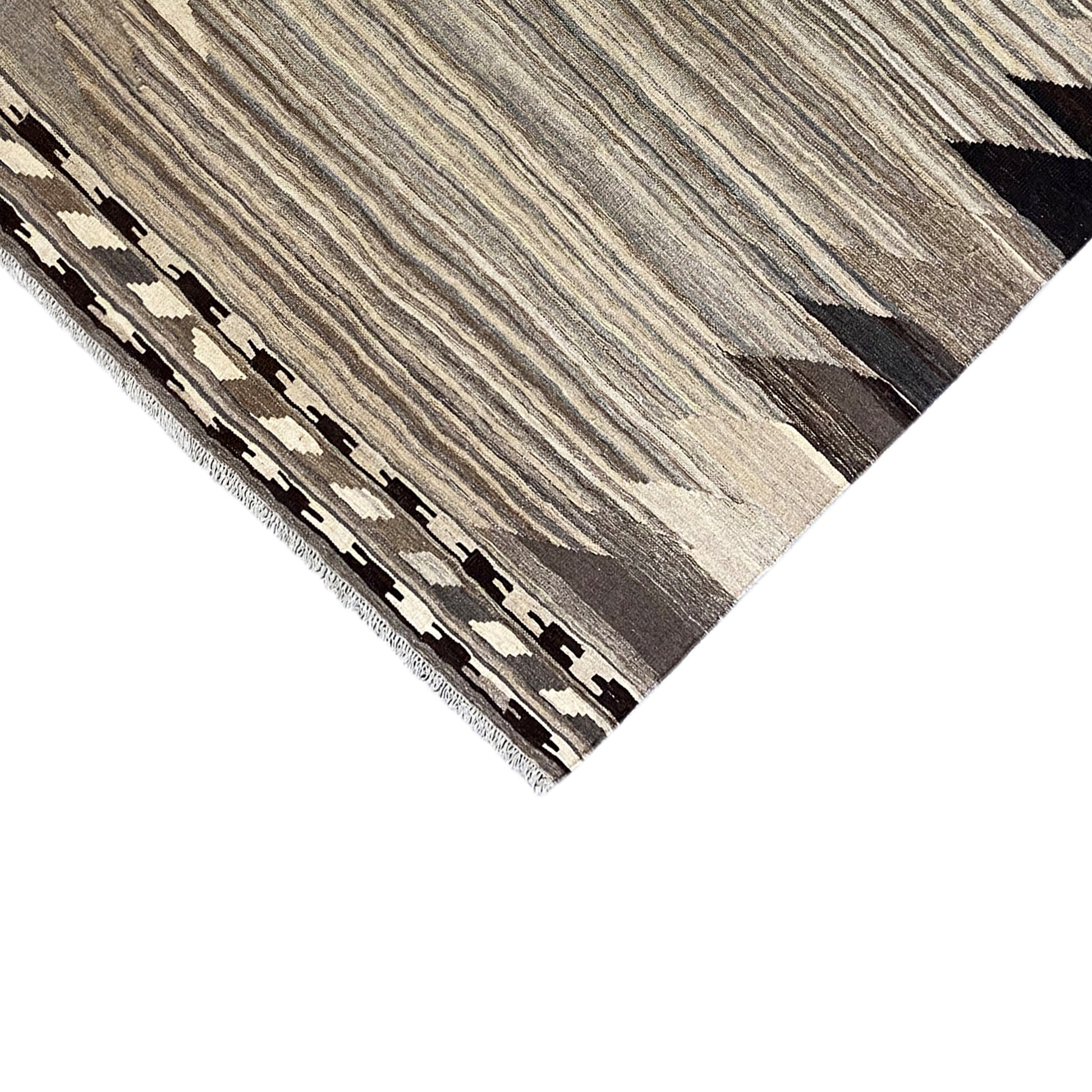 Esta alfombra Kelim Qashqai, tejida a mano con lana hilada a mano, presenta un diseño abstracto único con formas geométricas marcadas y rayas en tonos naturales de gris y beige. Con un tamaño de 197x148 cm, esta alfombra de tejido plano resistente es ideal para complementar estilos de decoración modernos, minimalistas o escandinavos. Combina la artesanía tradicional con una estética contemporánea y crea una atmósfera tranquila pero expresiva que realza cualquier espacio y ofrece durabilidad.
