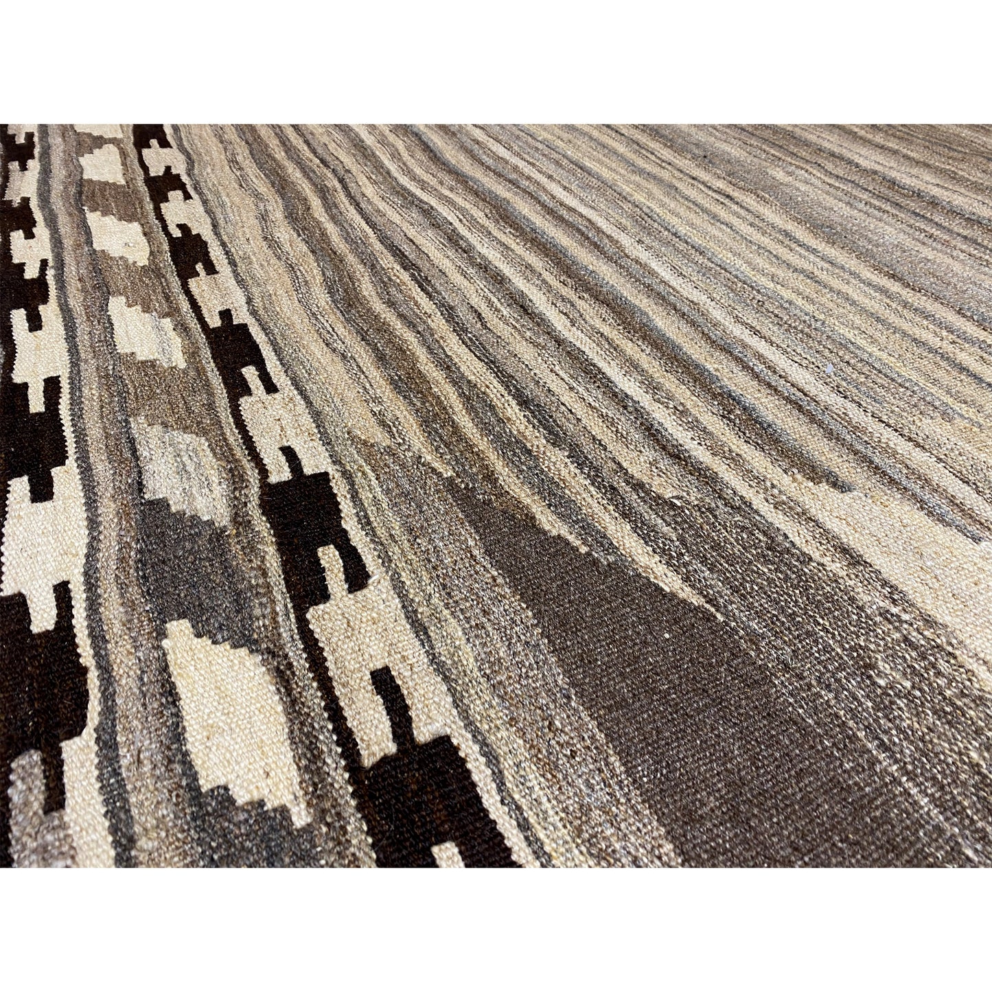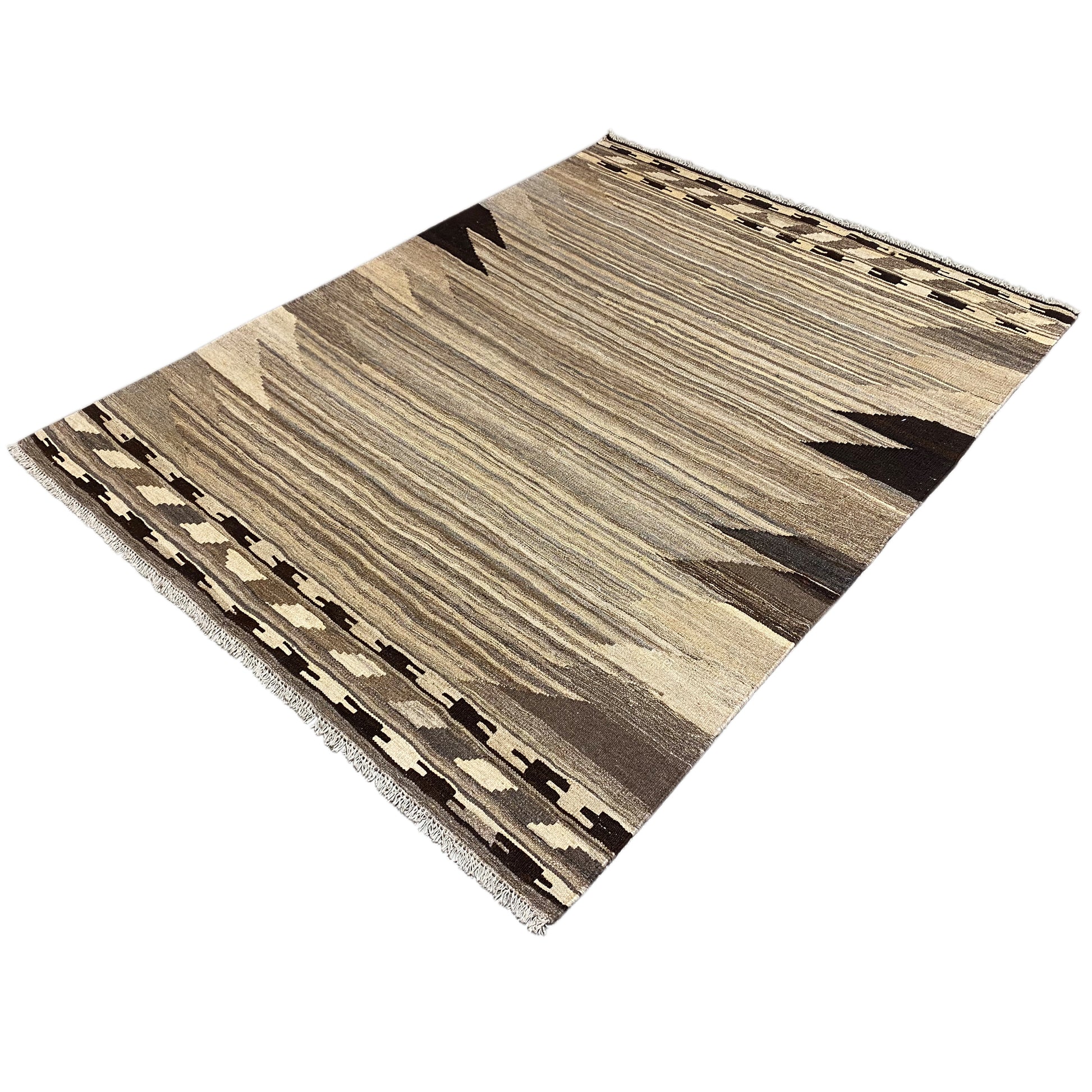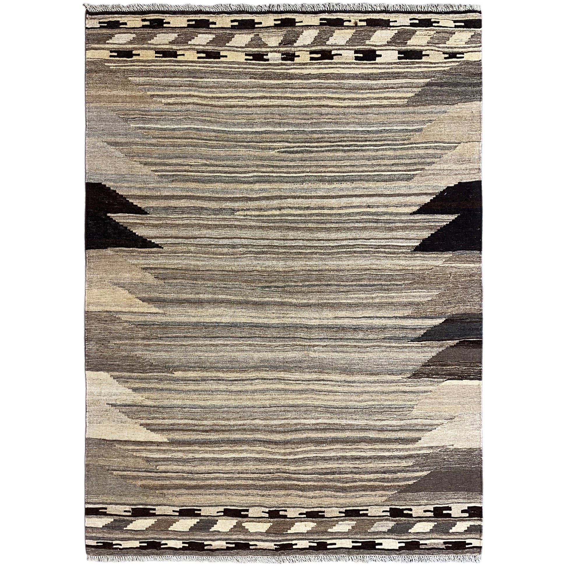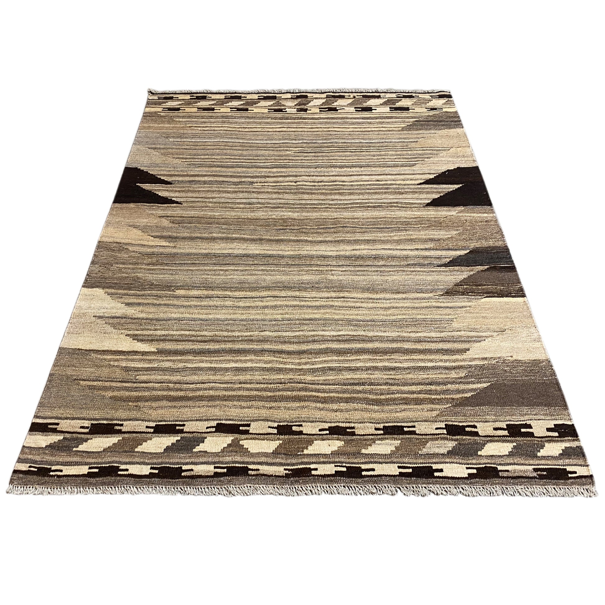 Esta alfombra Kelim Qashqai, tejida a mano con lana hilada a mano, presenta un diseño abstracto único con formas geométricas marcadas y rayas en tonos naturales de gris y beige. Con un tamaño de 197x148 cm, esta alfombra de tejido plano resistente es ideal para complementar estilos de decoración modernos, minimalistas o escandinavos. Combina la artesanía tradicional con una estética contemporánea y crea una atmósfera tranquila pero expresiva que realza cualquier espacio y ofrece durabilidad.