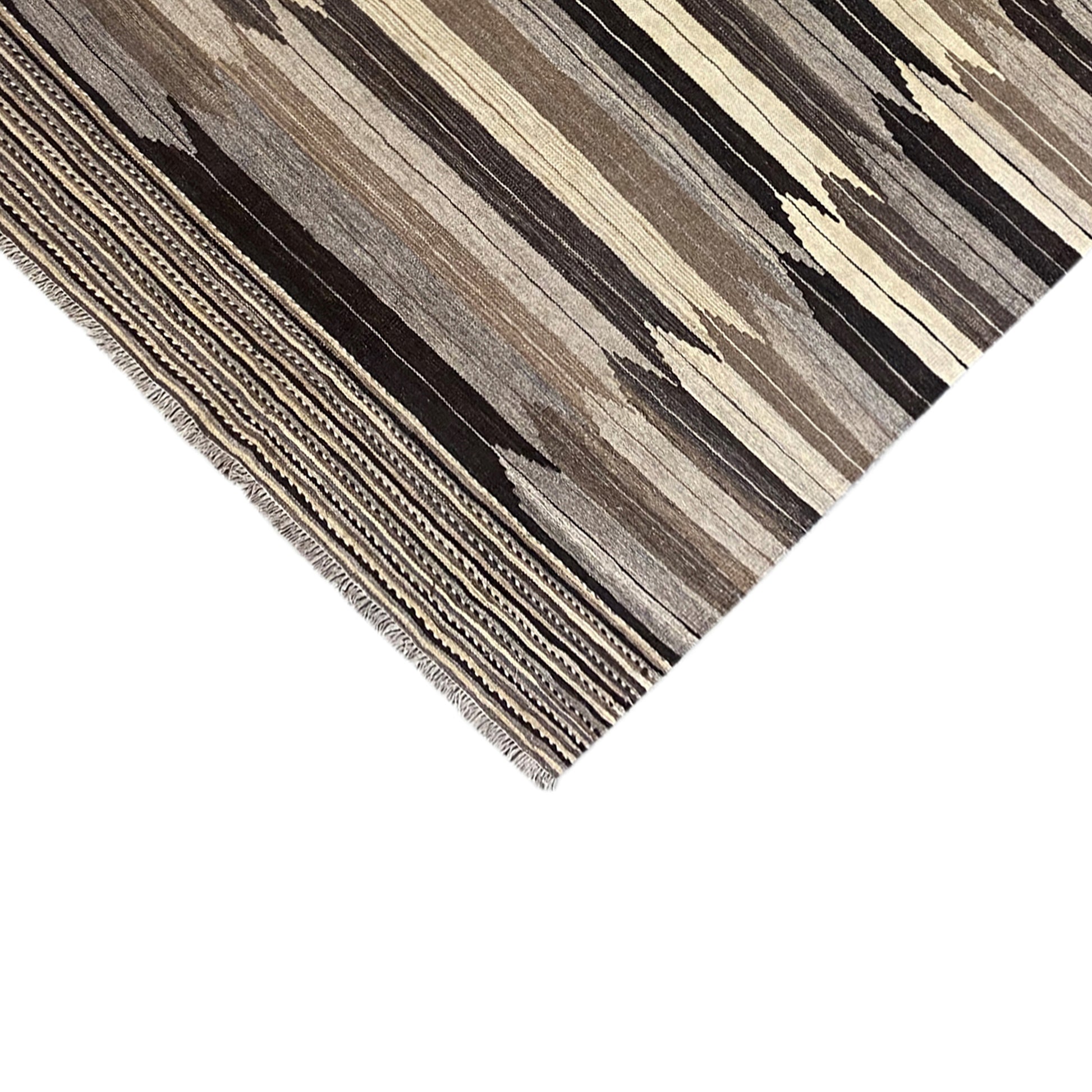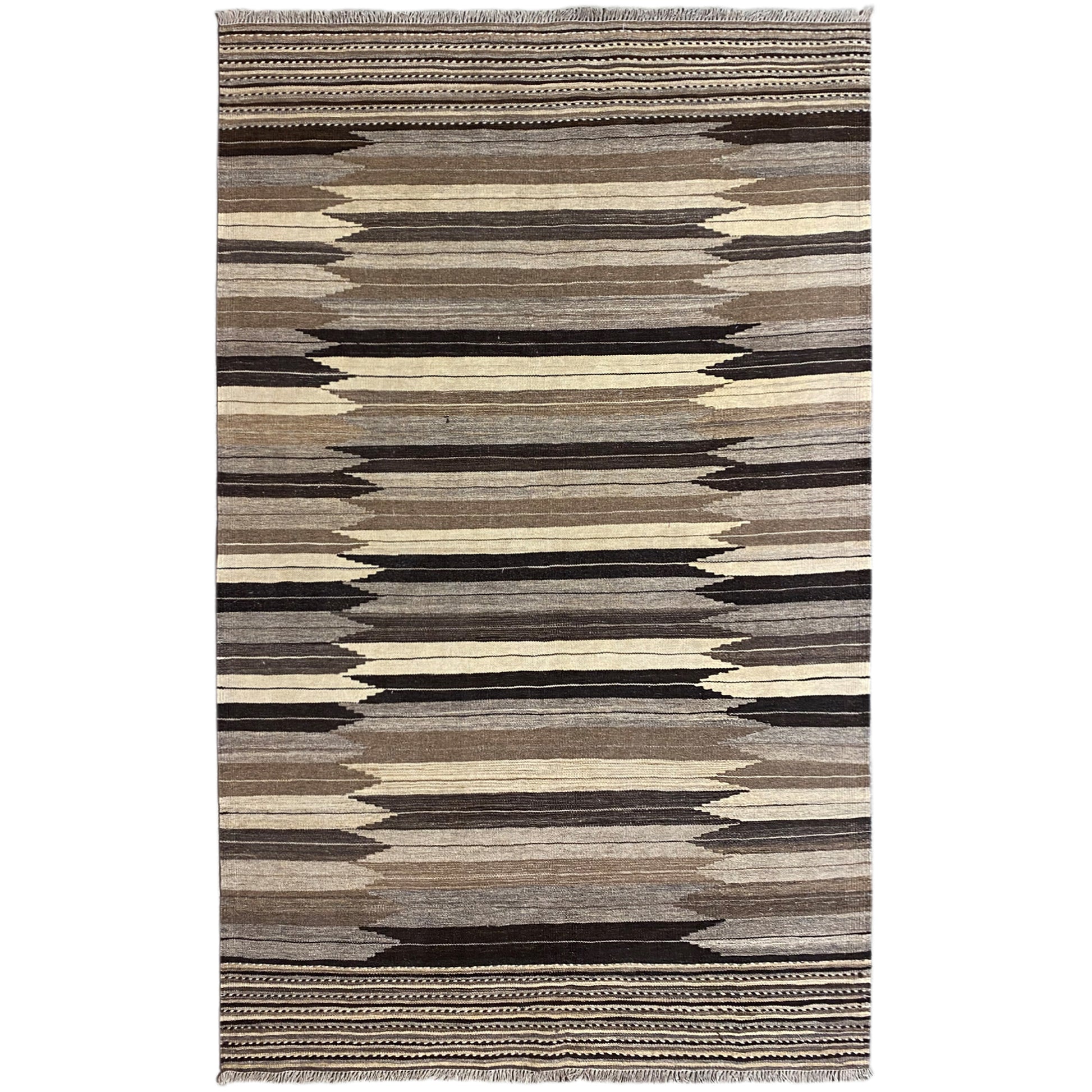 Este Kelim Qashqai tejido a mano con lana hilada a mano destaca por su llamativo patrón a rayas en tonos naturales de gris y beige, que aporta a cualquier espacio un toque moderno y a la vez terroso. Con un tamaño generoso de 217x142 cm, esta alfombra de tejido plano resistente es ideal para salas de estar o comedores, ofreciendo una superficie duradera y fácil de mantener. Su diseño único combina la artesanía tradicional con una estética contemporánea, creando un ambiente cálido y acogedor.
