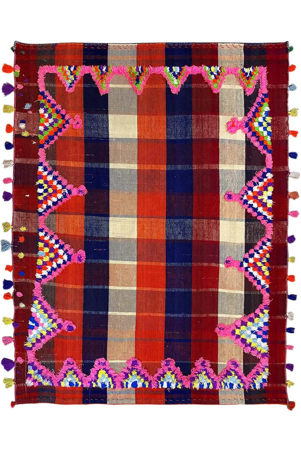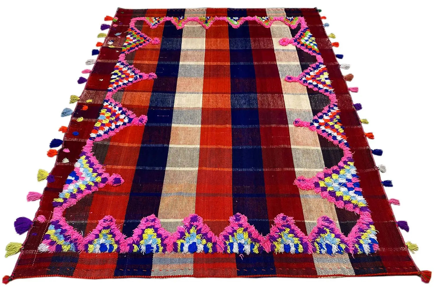 Los Jajim son especialmente conocidos por su singular intensidad de color y calidad. Esto se logra mediante procesos naturales de teñido con plantas. A diferencia de nuestras otras alfombras, los Jajim se tejen y no se anudan. Este proceso de fabricación hace que el Jajim sea muy plano. Este método de producción también es una tradición nómada de siglos de antigüedad. Los nómadas no solo usaban las alfombras tejidas terminadas como decoración de suelo, sino también, entre otras cosas, como decoración de paredes o como material para fabricar tiendas. Técnicas especiales de procesamiento y colores naturales obtenidos de plantas le dan a los Kelims un aspecto único.