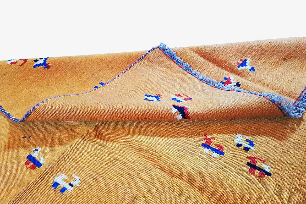 A diferencia de nuestras otras alfombras, los kilims se tejen y no se anudan. Este proceso de fabricación hace que el kilim sea muy plano. Este proceso de fabricación también es una tradición nómada de siglos de antigüedad. Los nómadas no solo usaban las alfombras tejidas terminadas como decoración de suelo, sino también, entre otras cosas, como decoración de paredes o como material para fabricar tiendas. Los métodos especiales de procesamiento y los colores naturales obtenidos de plantas le dan a los kelims un aspecto único.
