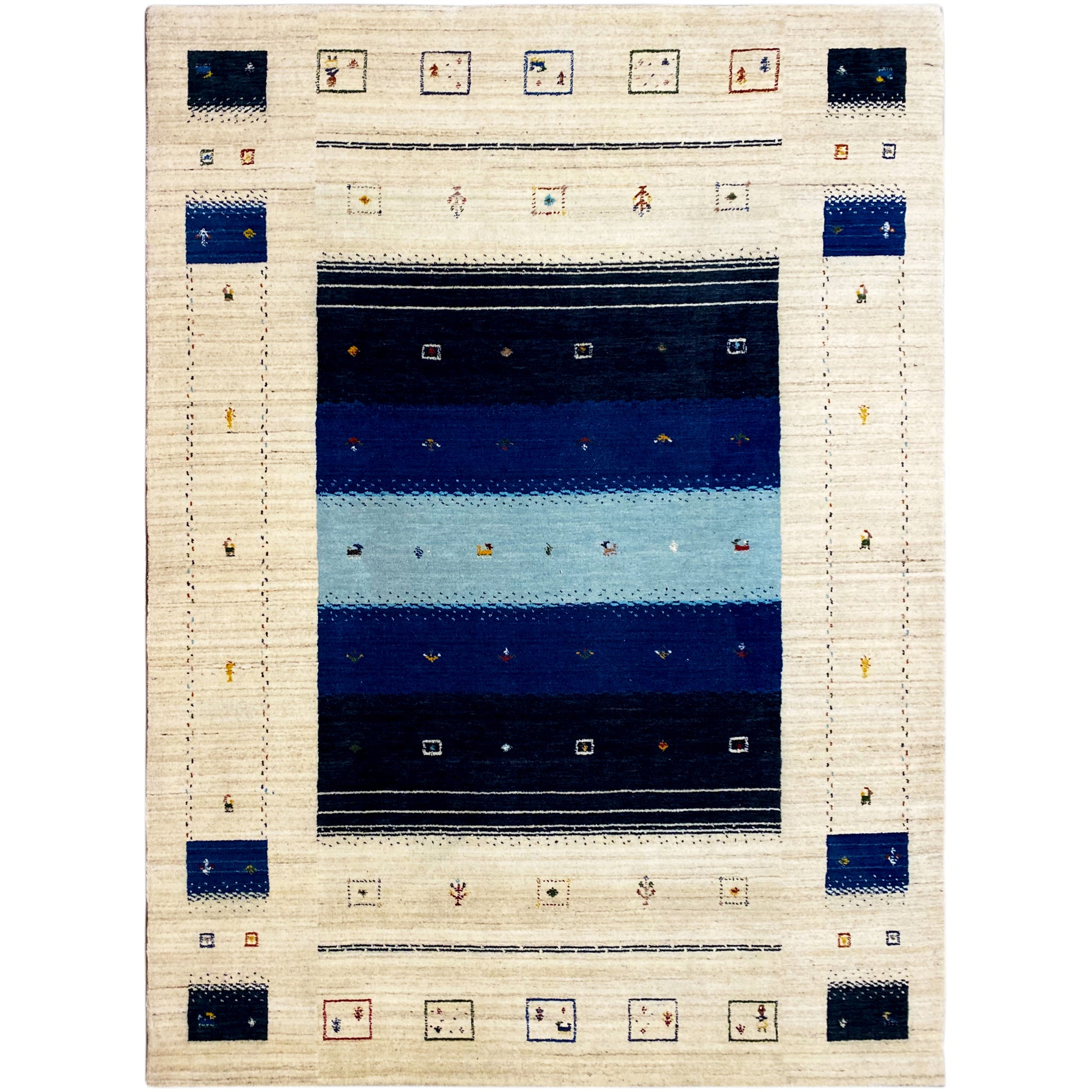 Dieser handgewebte Loom Luri Teppich aus hochwertiger Wolle überzeugt durch seine elegante Farbkombination und langlebige Qualität. Die Kombination aus Creme und verschiedenen Blautönen verleiht dem Raum eine ruhige und stilvolle Atmosphäre und passt perfekt zu modernen, skandinavischen und maritimen Wohnstilen. Das geometrisch-traditionelle Muster mit feinen, ethnischen Details sorgt für eine harmonische und strukturierte Optik. Mit seiner Größe von 241x173 cm eignet sich der Teppich ideal für Wohn- oder Essbereiche und bietet angenehmen Komfort sowie natürliche Wärme.