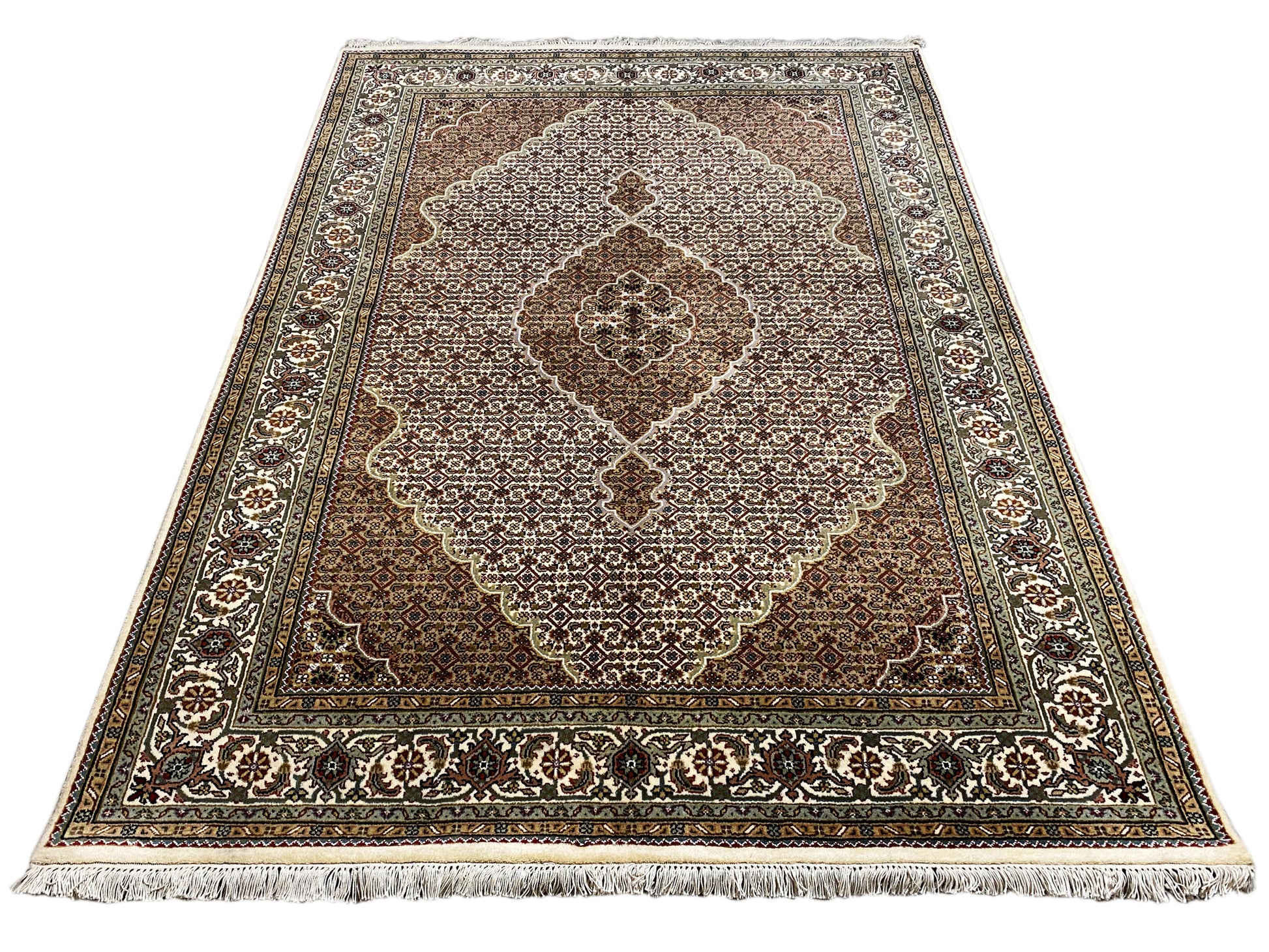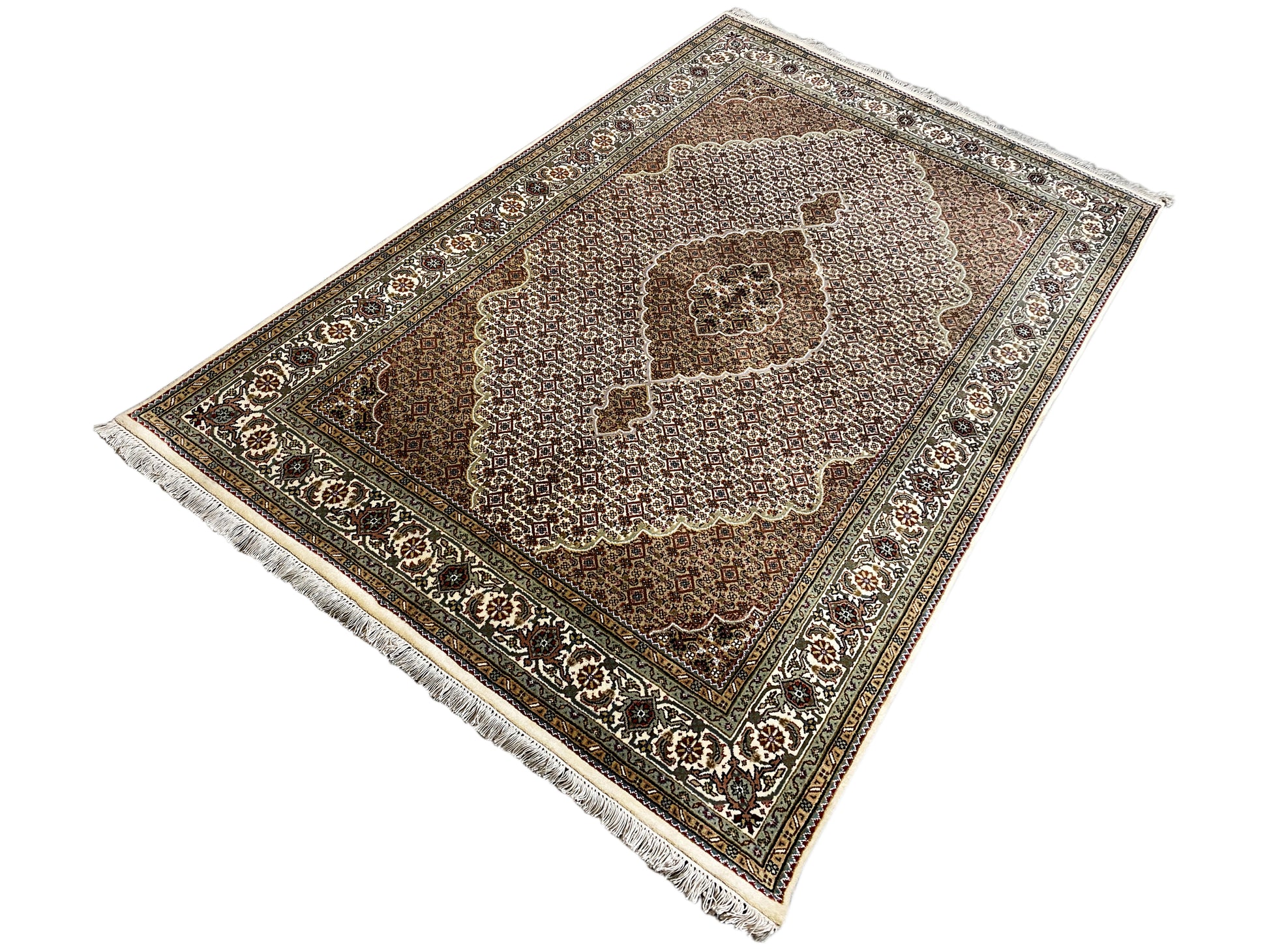 El Tabriz Mahi proviene originalmente de Persia. Sin embargo, hoy en día estas alfombras también se anudan a mano en India con los mismos estándares de calidad. Nuestros Mahi son alfombras de alta calidad y elegancia, hechas con lana fina. Las alfombras tienen colores intensos, claros y profundos y, debido a su buena fabricación, son muy resistentes.
