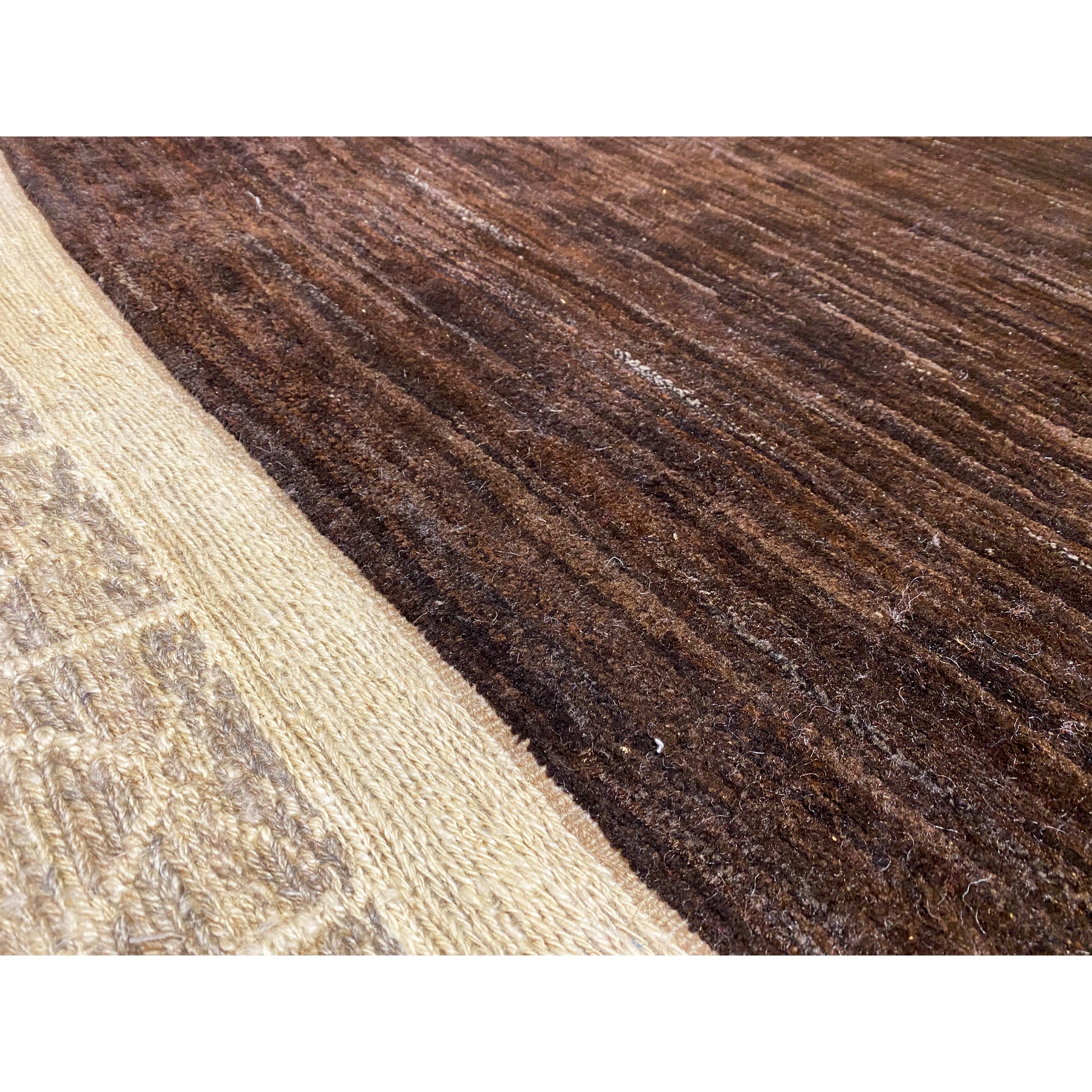Fabricado con lana hilada a mano y teñida con plantas, la alfombra destaca por su patrón tranquilo y en bloques en marrón profundo con sutiles acentos claros. Con sus medidas de 184x113 cm, es ideal para espacios pequeños, pasillos o como un acento elegante en áreas modernas de la vivienda.