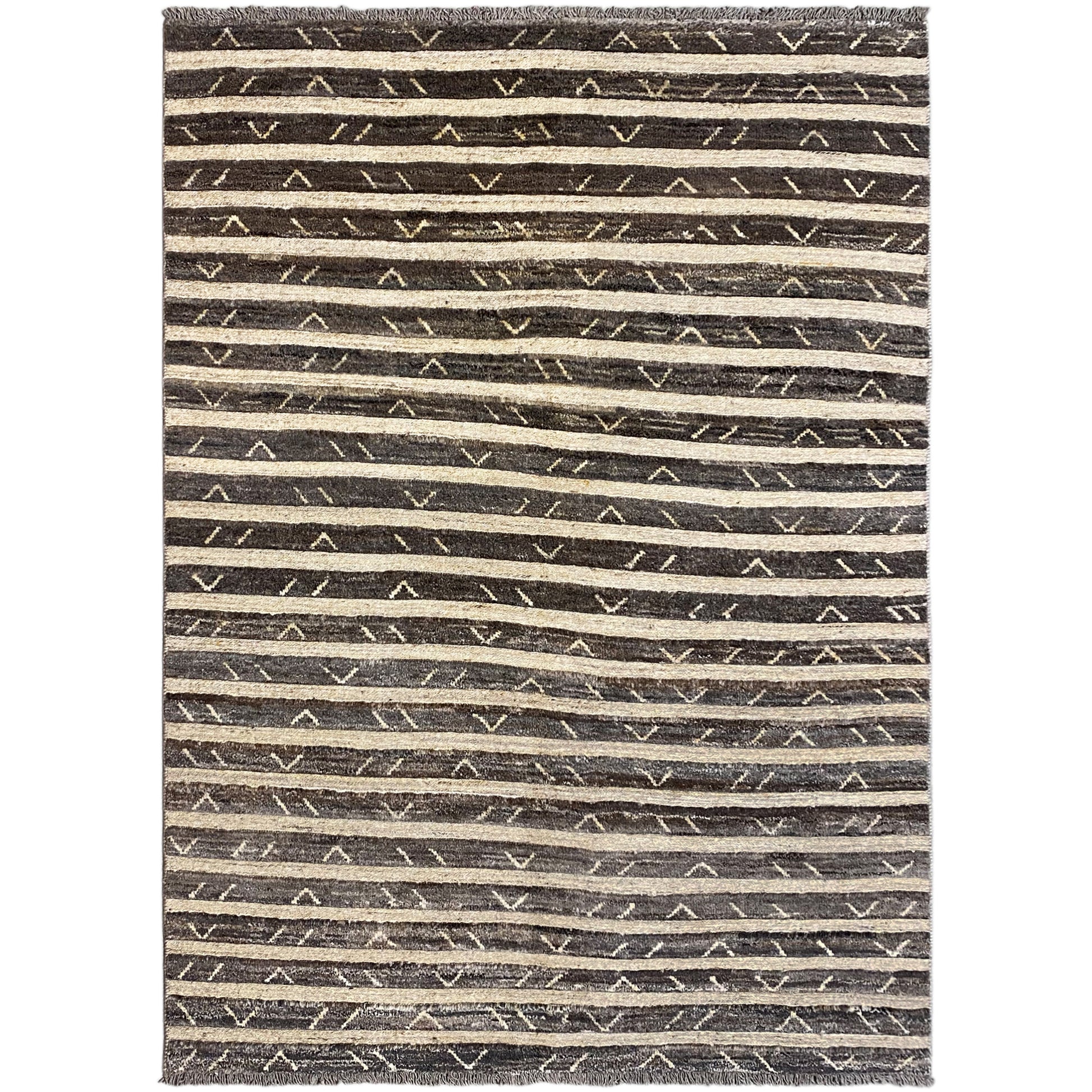 Hecho de lana hilada a mano y teñida con plantas, la alfombra cautiva con su fino patrón de rayas en suaves tonos grises y beige, complementado con discretos acentos geométricos. Las generosas dimensiones de 195x150 cm la hacen ideal para salas de estar, dormitorios o como un elegante punto focal en un interior bohemio.