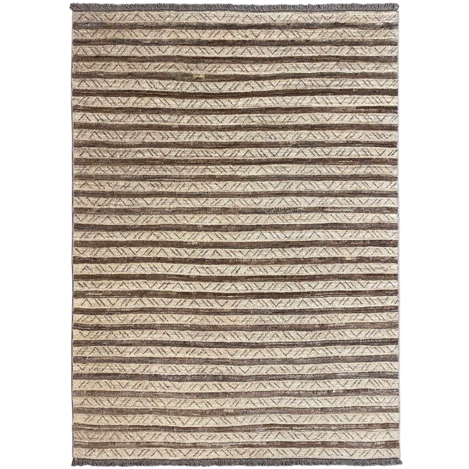 Fabricado con lana virgen hilada a mano y teñida con plantas, la alfombra destaca por su calidad duradera y su elegante patrón de rayas en tonos beige y marrón. La armoniosa combinación de colores la hace versátil para cualquier espacio, ya sea la sala, el dormitorio o la entrada.
