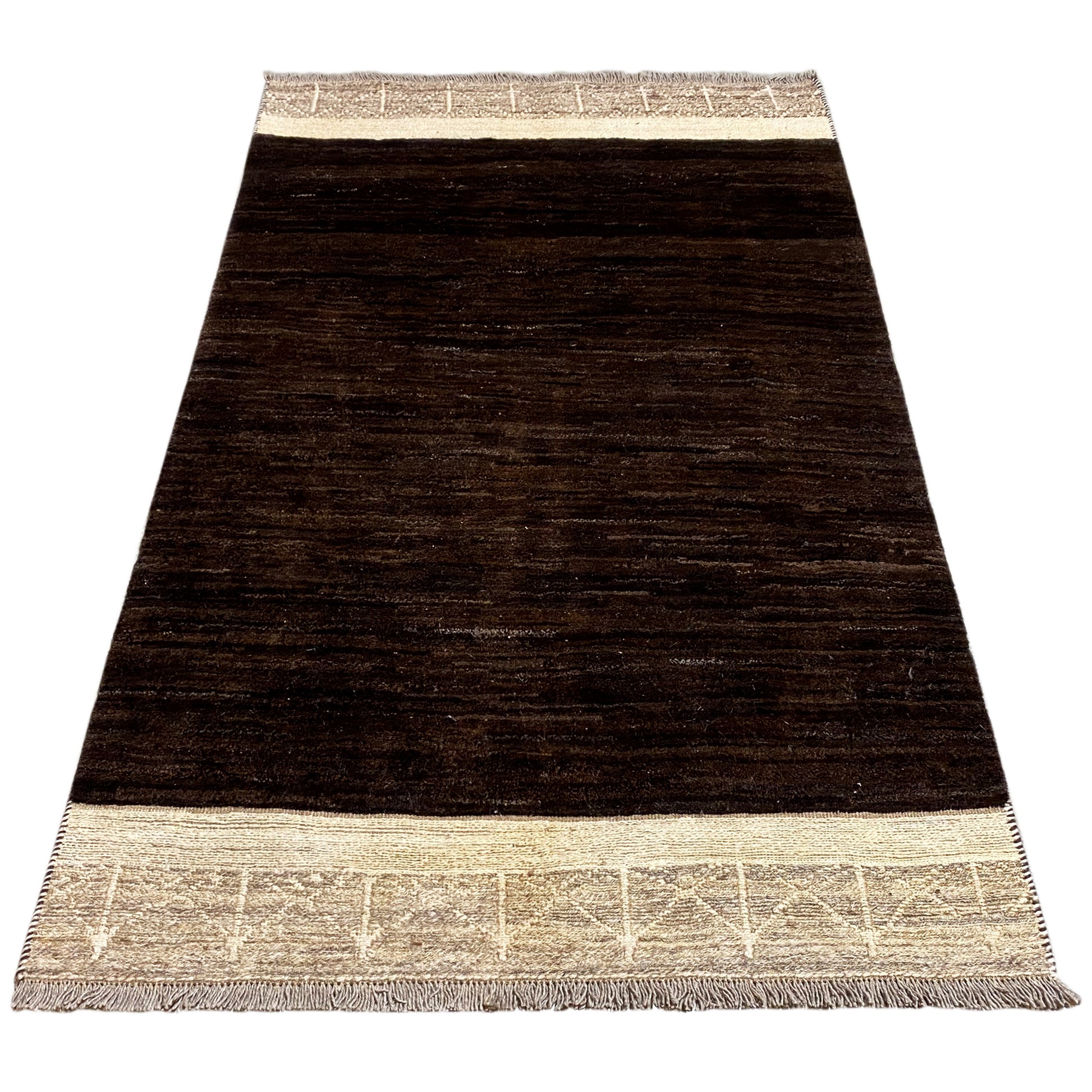 Fabricado con lana hilada a mano y teñida con plantas, la alfombra destaca por su patrón tranquilo y en bloques en marrón profundo con sutiles acentos claros. Con sus medidas de 184x113 cm, es ideal para espacios pequeños, pasillos o como un acento elegante en áreas modernas de la vivienda.