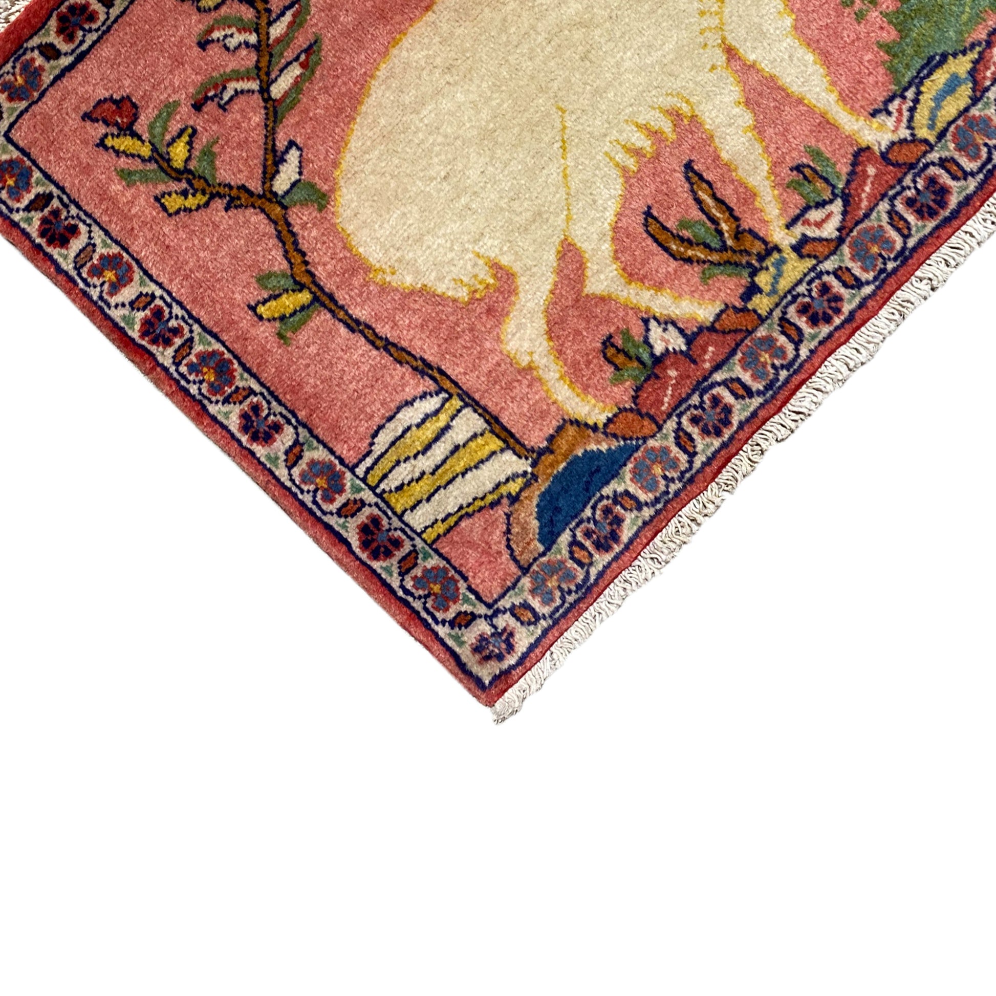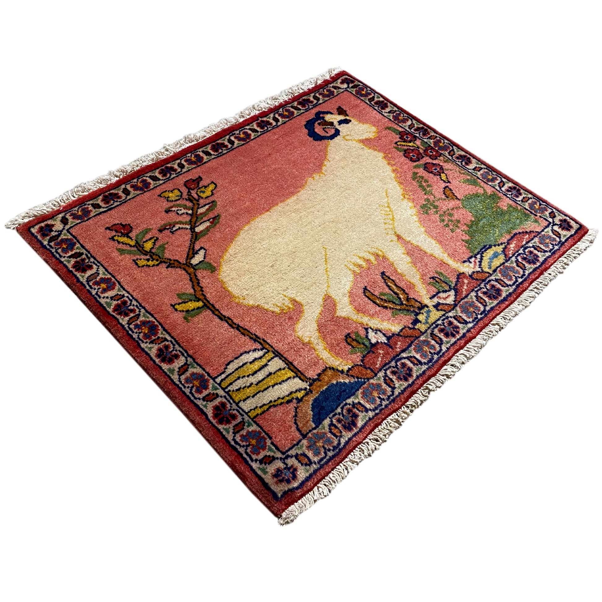 Esta encantadora alfombra Poshti anudada a mano es un testimonio auténtico del arte textil nómada del grupo tribal "Tork" del sur de Irán, conocido por sus característicos tapices "Torkey". Con unas medidas de 54x44 cm, esta pieza de lana y algodón presenta un suave fondo rosa antiguo que sirve de escenario para una destacada representación estilizada de un carnero. Rodeada de encantadores elementos florales y un patrón paisajístico sugerido, esta alfombra es ideal para aportar un toque único, narrativo y tradicional a cualquier espacio pequeño o superficie de pared.