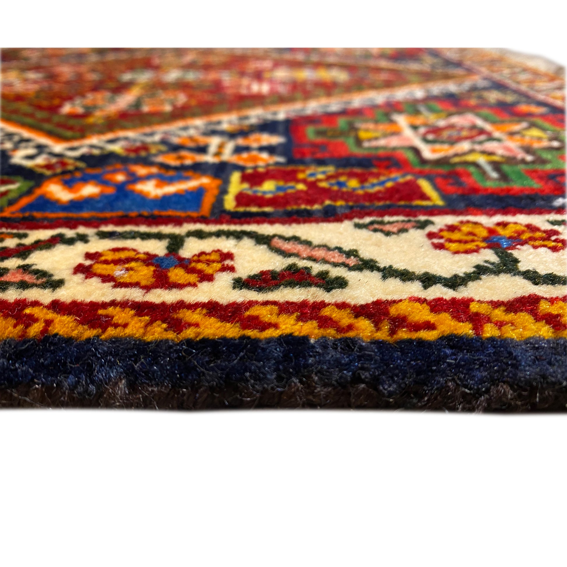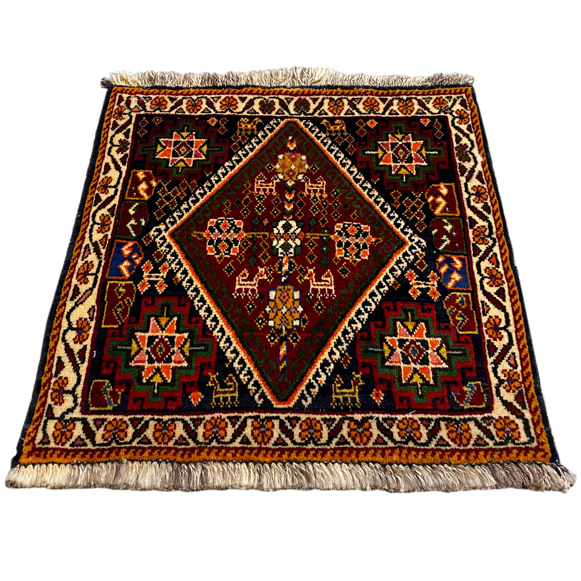 Esta exquisita alfombra Poshti anudada a mano es una verdadera joya del sur de Irán, elaborada artísticamente por el grupo tribal nómada "Tork", conocido por sus alfombras "Torkey". Con unas medidas de 57x56 cm, esta pieza presenta una fascinante combinación de un profundo azul oscuro de fondo y un diseño romboidal de base roja y terrosa en el centro. El medallón central está lleno de complejos patrones geométricos y tribales, que también se encuentran en los campos circundantes y en el borde. Fabricada con fina lana y urdimbre de algodón, esta alfombra aporta a cualquier espacio un toque de auténtica tradición y expresión artística.