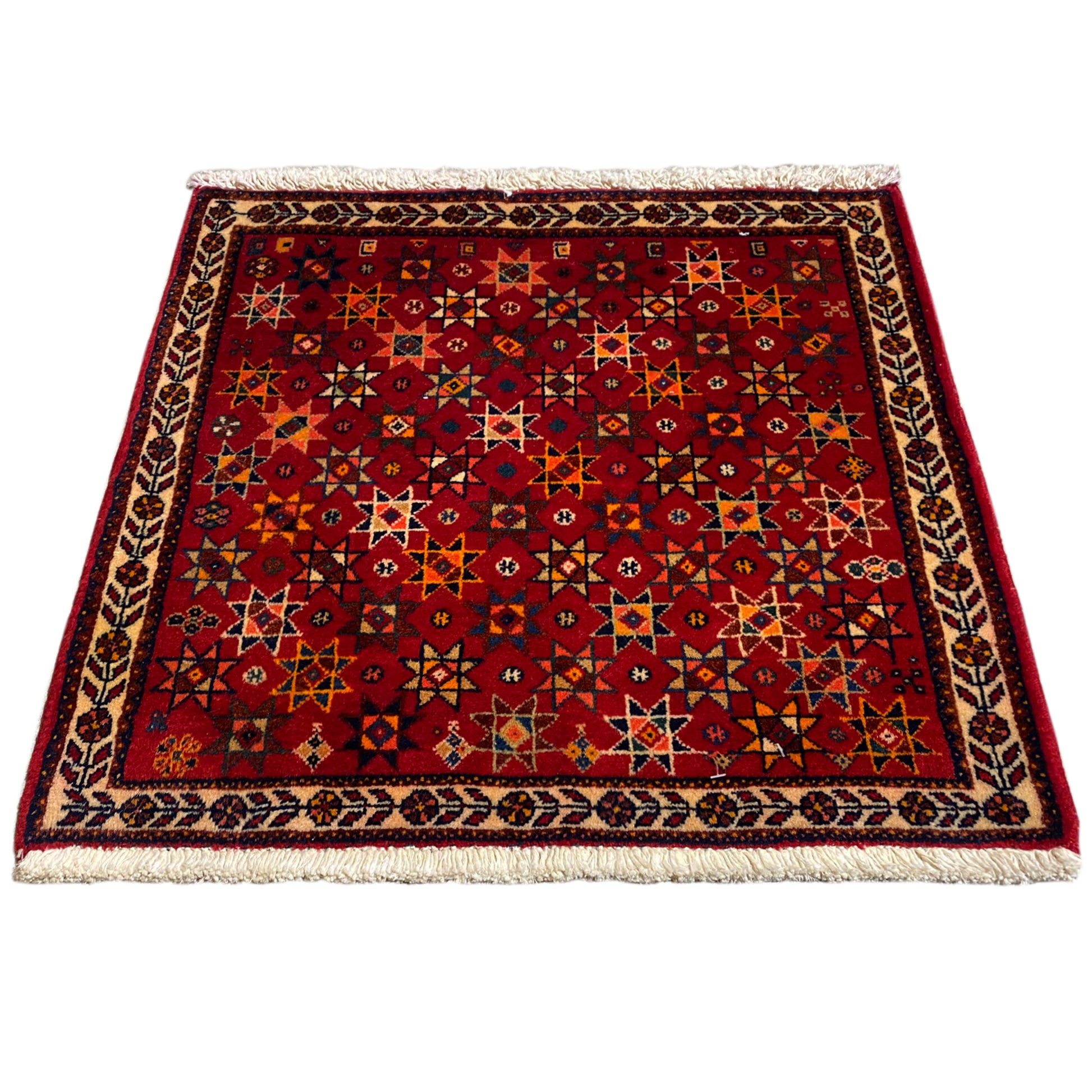 Esta exquisita alfombra Poshti anudada a mano es un testimonio colorido del arte textil nómada del grupo tribal "Tork" del sur de Irán, conocido por sus característicos tapices "Torkey". Con unas medidas de 59x56 cm, esta pieza de lana y algodón destaca por un fondo rojo vibrante que enmarca un medallón multicolor detallado en el centro. Especialmente únicas son las cuatro representaciones estilizadas de animales azules en las esquinas, que le dan a esta alfombra un toque inconfundible. Ideal para aportar a cualquier espacio un aire de decoración tradicional y expresión artística, combina durabilidad con atractivo visual.
