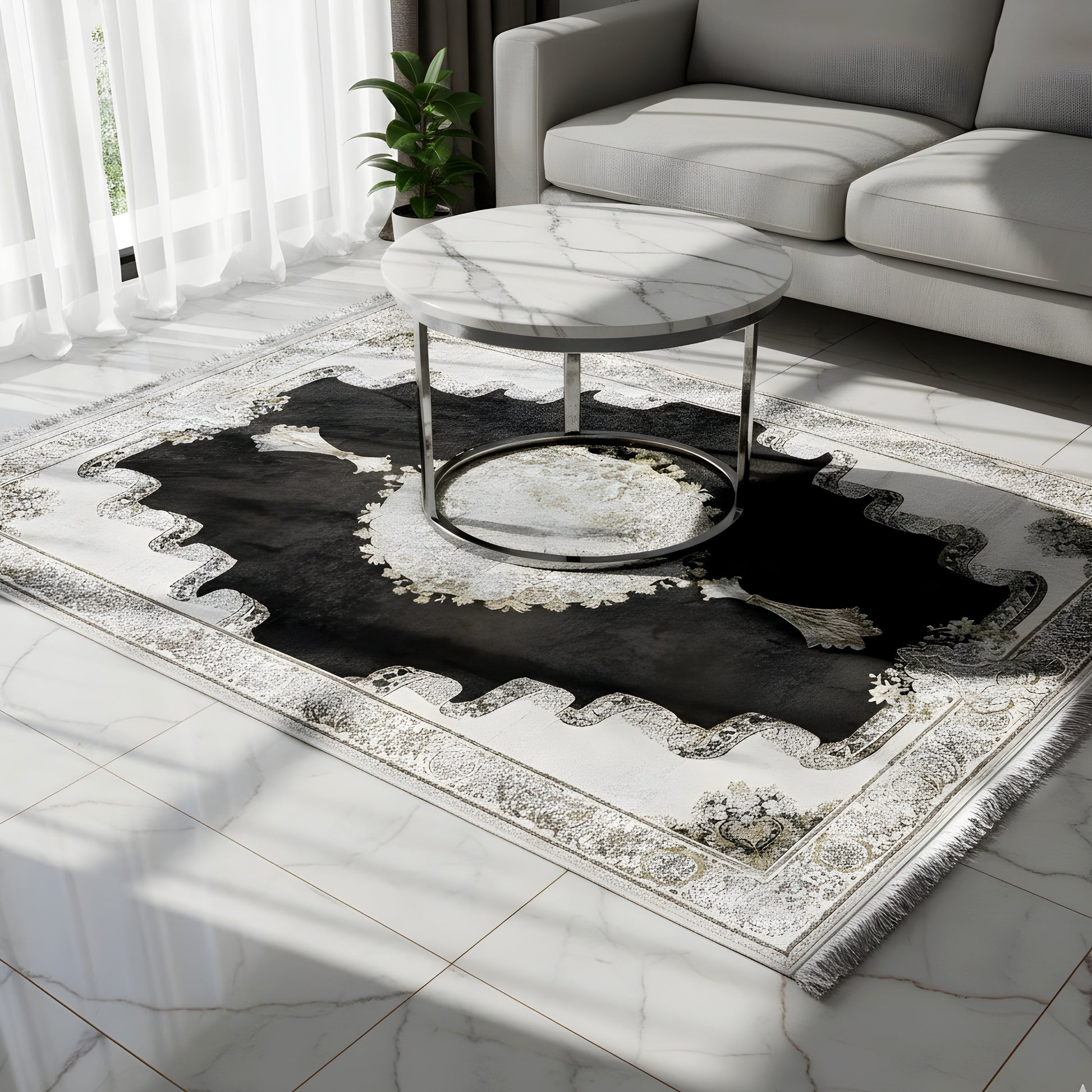 Dale a tu hogar un toque de elegancia dramática con esta hermosa alfombra clásica. Su llamativo campo interior oscuro en gris humo crea un impresionante contraste con el borde claro color crema y el medallón detallado en el centro. El patrón único del borde añade un acento lujoso adicional. Fabricada con 100% acrílico tratado térmicamente, esta alfombra suave y resistente es perfecta para áreas de mucho tránsito, ya que combina estilo lujoso con durabilidad moderna. El tamaño generoso de 170x240cm es ideal para aportar un punto focal elegante a tu sala de estar o dormitorio.
