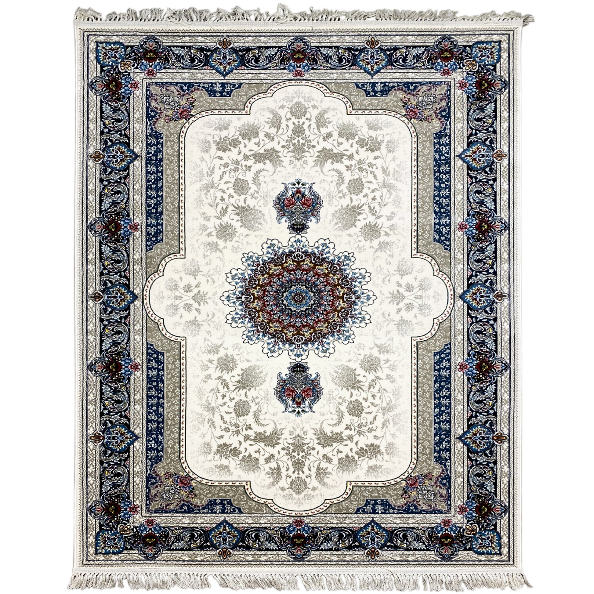 Añada un toque de elegancia refinada a su espacio con esta hermosa alfombra clásica. El artístico medallón central destaca sobre un campo crema claro, enmarcado por un borde sofisticado con patrones elaborados en ricos tonos azul marino y tierra. Fabricada con 100% acrílico tratado térmicamente, esta alfombra suave y duradera es perfecta para áreas de alto tránsito y combina un estilo atemporal con resistencia moderna. El tamaño generoso de 170x240cm es ideal para aportar un punto focal lujoso a su sala de estar o dormitorio.